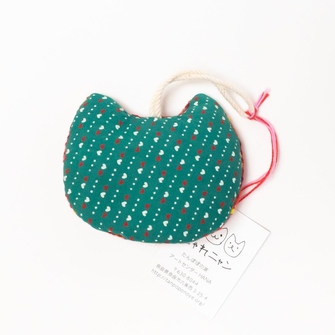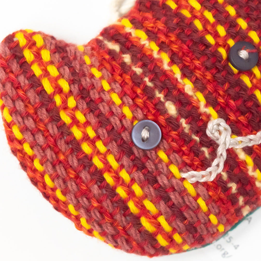 ネコちゃんのお顔のマスコットです。布と糸生地のバッジなので柔らかく、手作り感が感じられます。