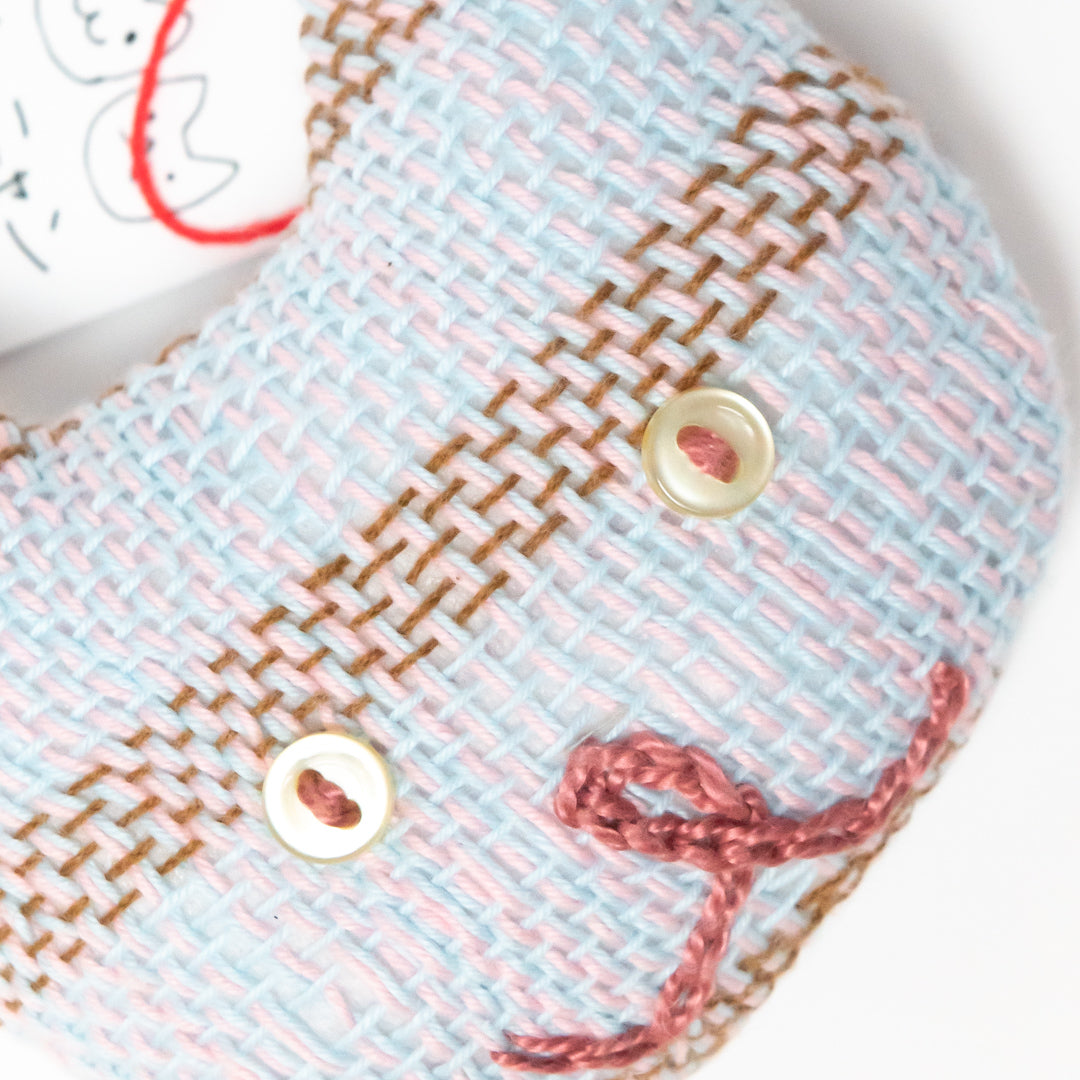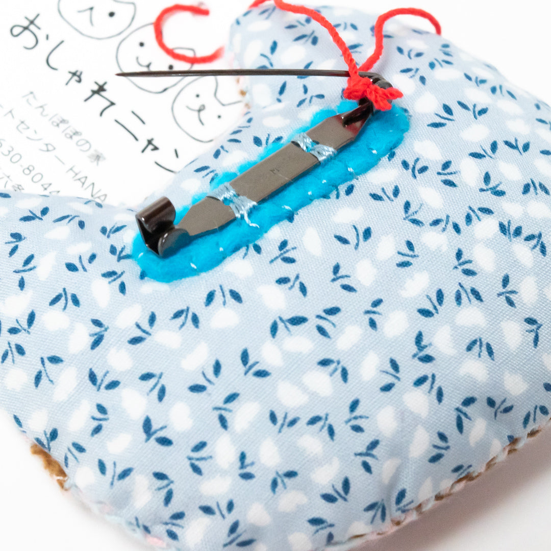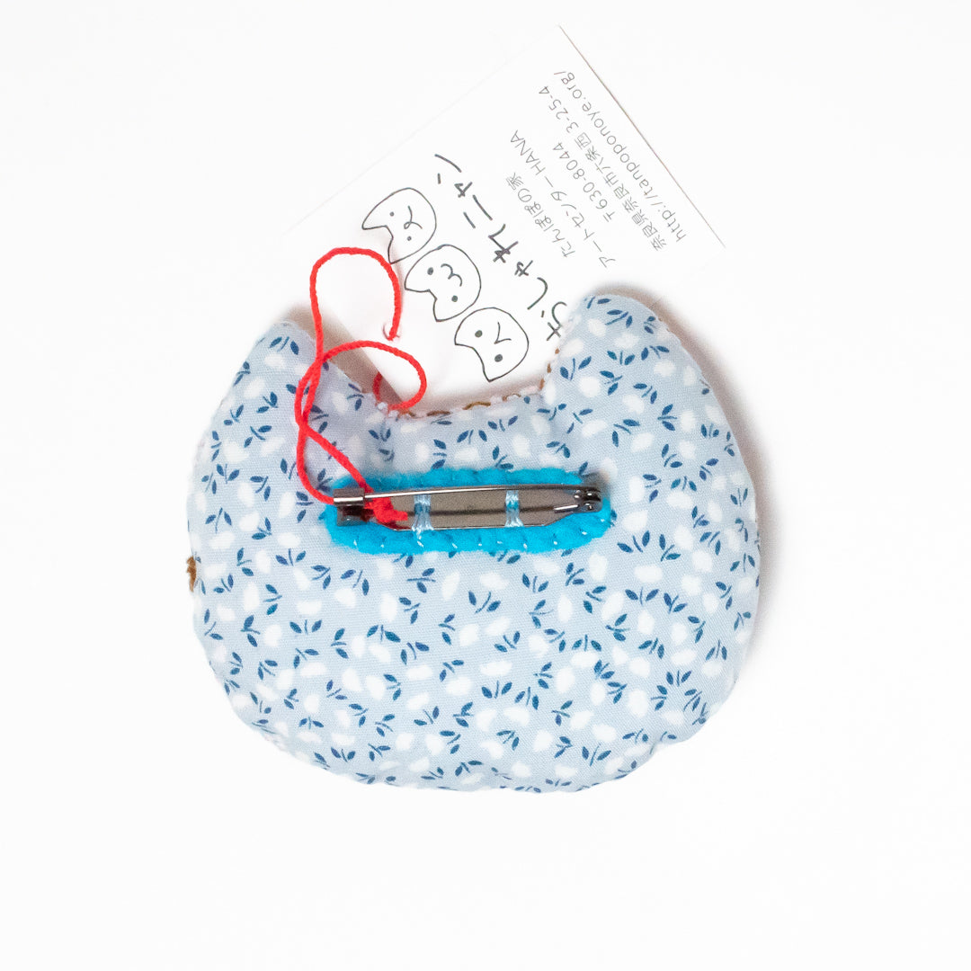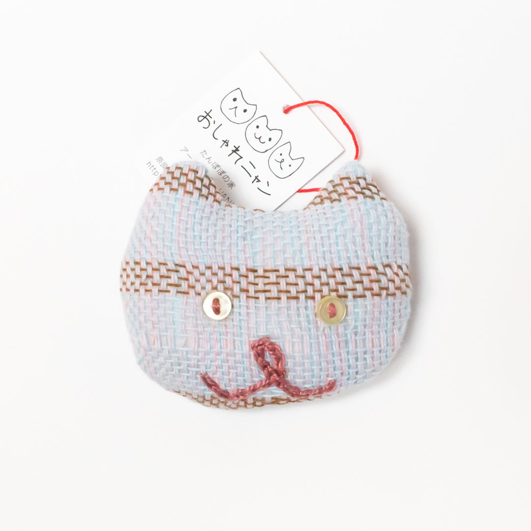 ネコちゃんのお顔のバッジです。布と糸生地のバッジなので柔らかく、手作り感が感じられます。