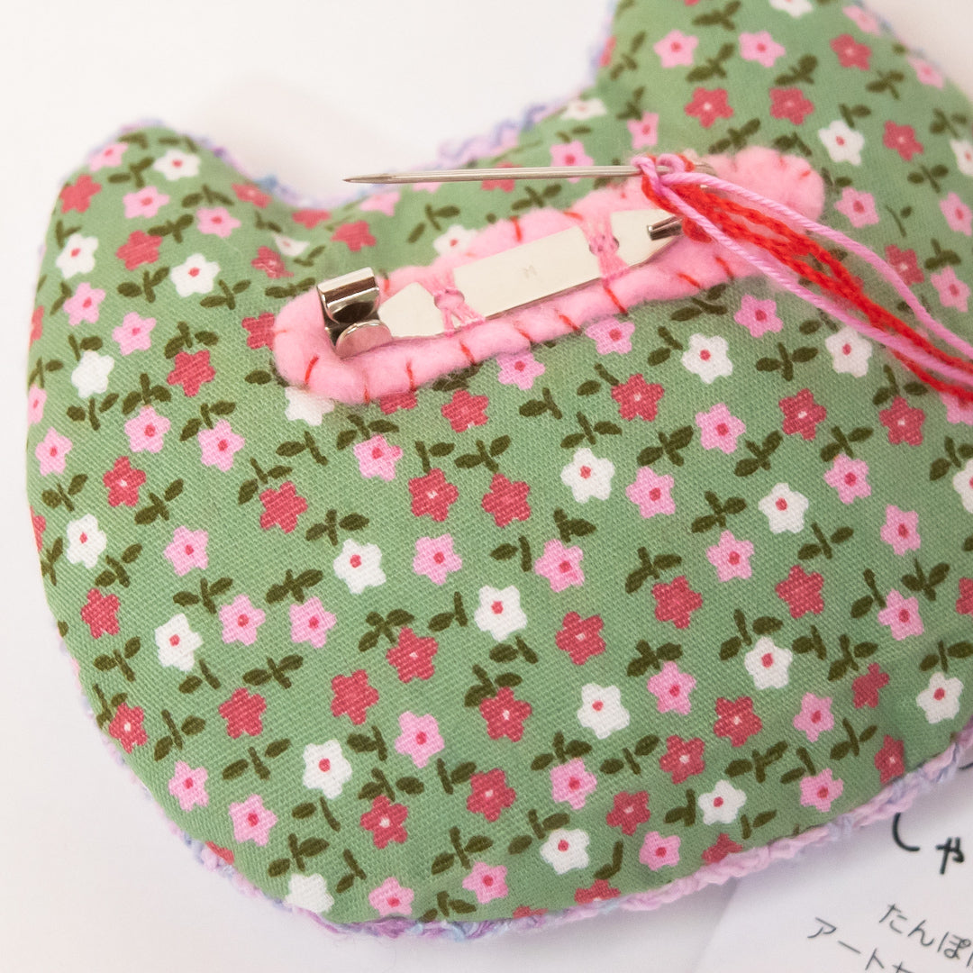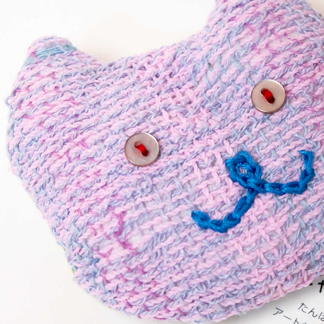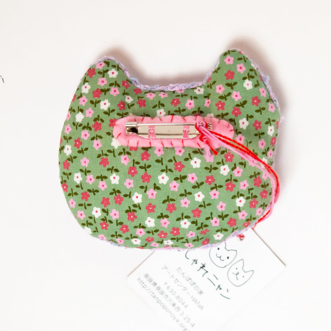 ネコちゃんのお顔のバッジです。布と糸生地のバッジなので柔らかく、手作り感が感じられます。