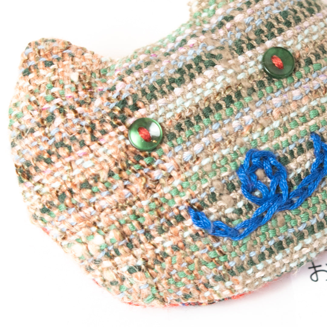 ネコちゃんのお顔のバッジです。布と糸生地のバッジなので柔らかく、手作り感が感じられます。