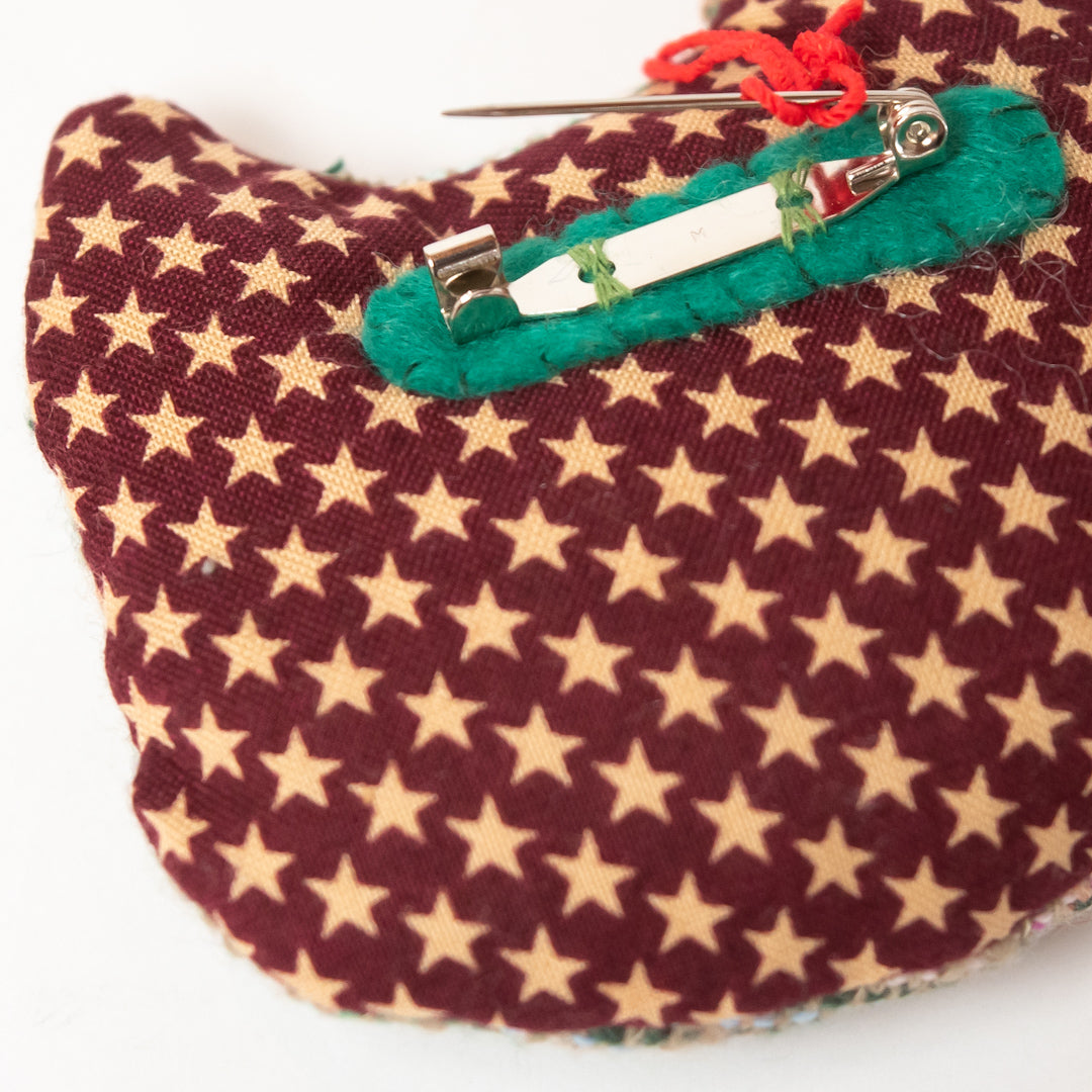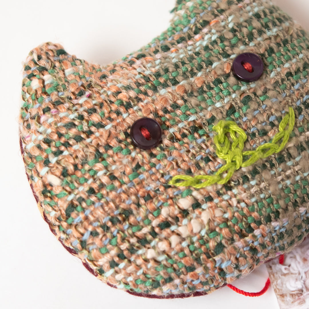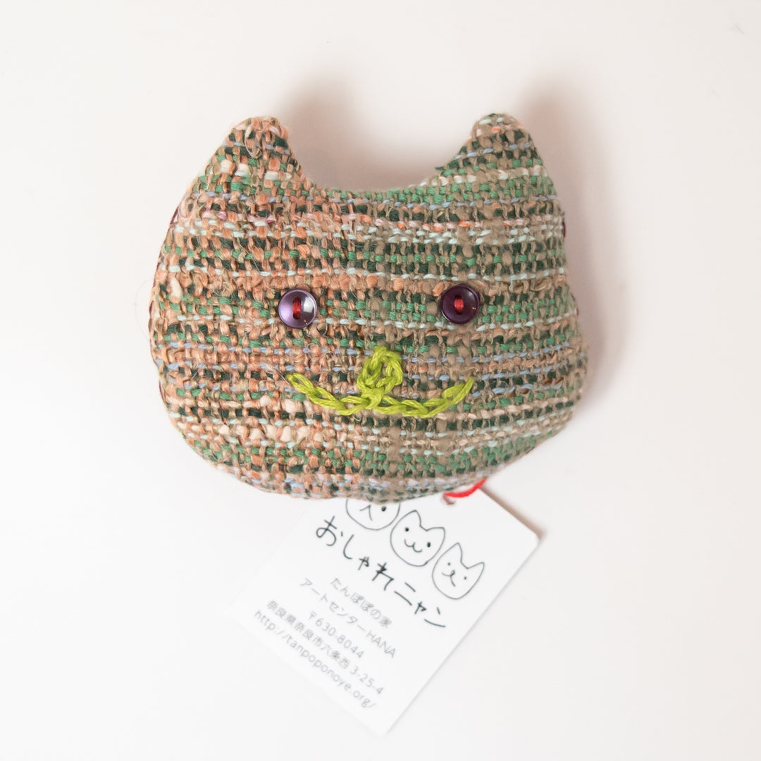 ネコちゃんのお顔のバッジです。布と糸生地のバッジなので柔らかく、手作り感が感じられます。