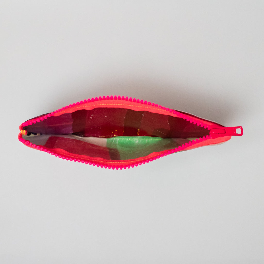 poRiffの主な材料は買い物したときにもらう買い物袋です。一見捨ててしまうような買い物袋たちをコラージュし、熱で圧着して完成するシートを使用してプロダクトに変えています。カラーはすべて買い物袋そのままの色、着色は一切していません。