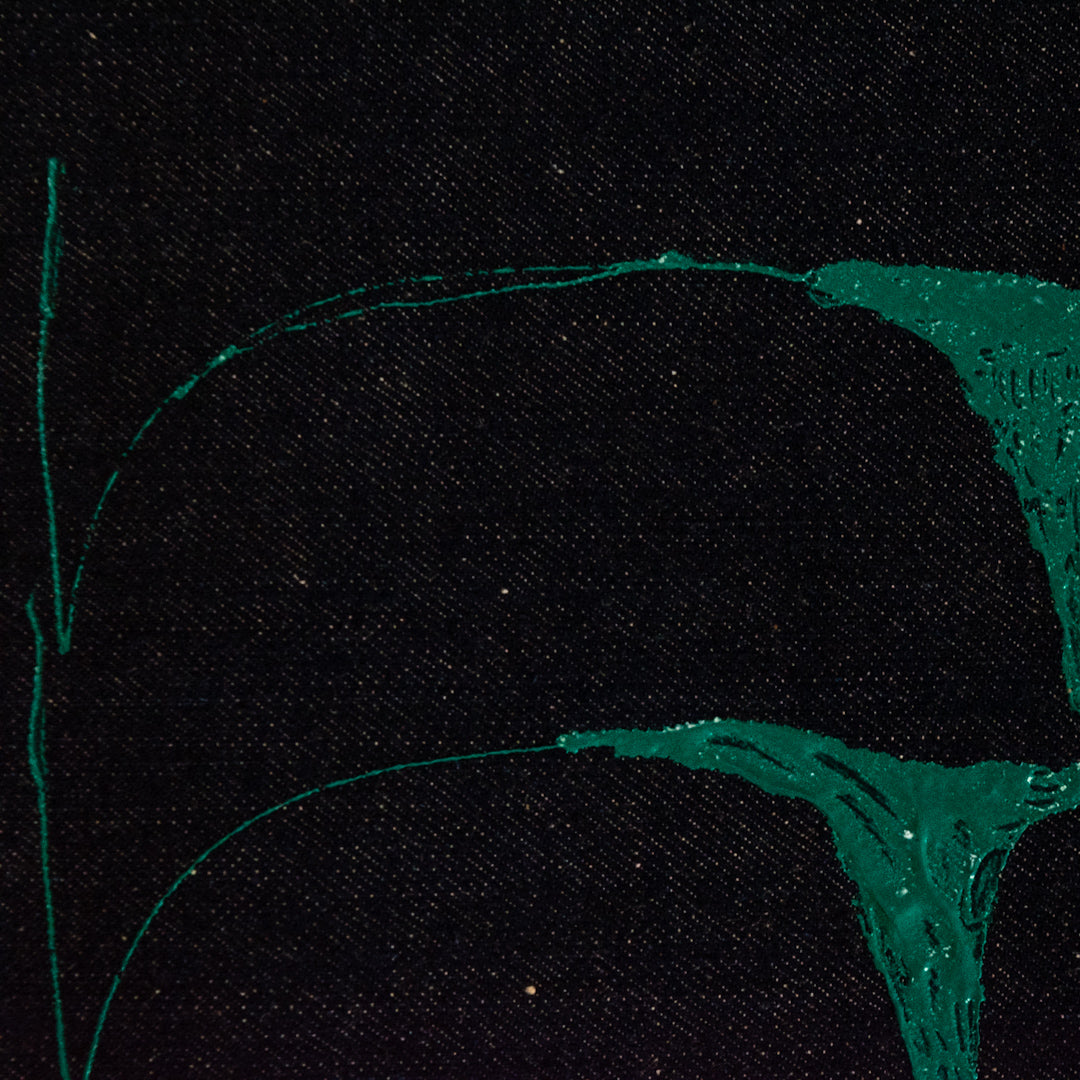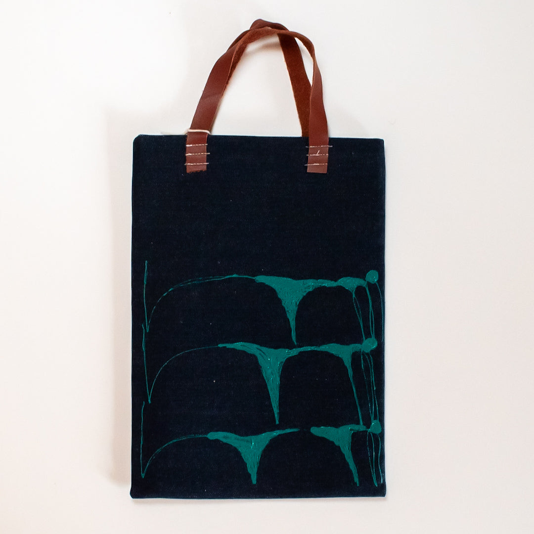 デニム素材に描かれた波の模様。ゆらぎのあるシャープな線がいきいきと波のうねりを伝えているようです。持ち手は合成皮革で、大人のお洒落なスタイルを醸し出しています。