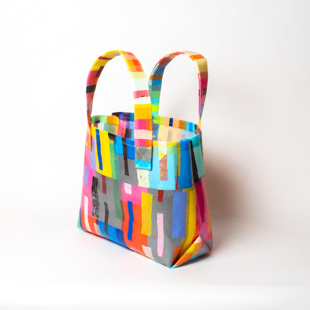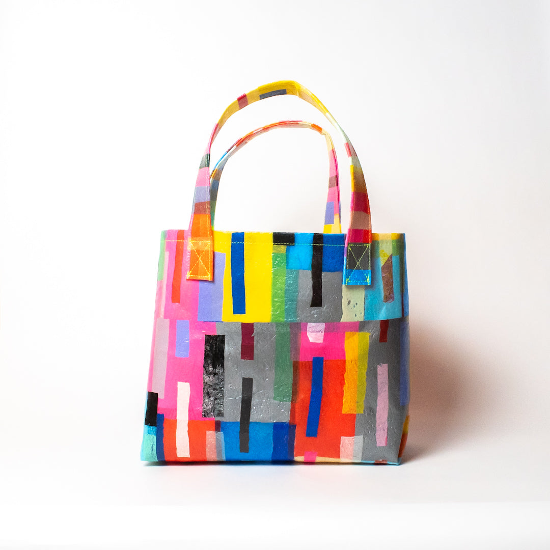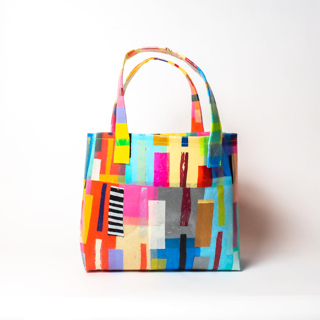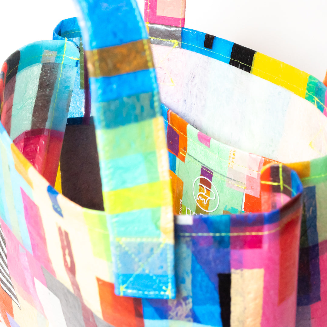 poRiffの主な材料は買い物したときにもらう買い物袋です。一見捨ててしまうような買い物袋たちをコラージュし、熱で圧着して完成するシートを使用してプロダクトに変えています。