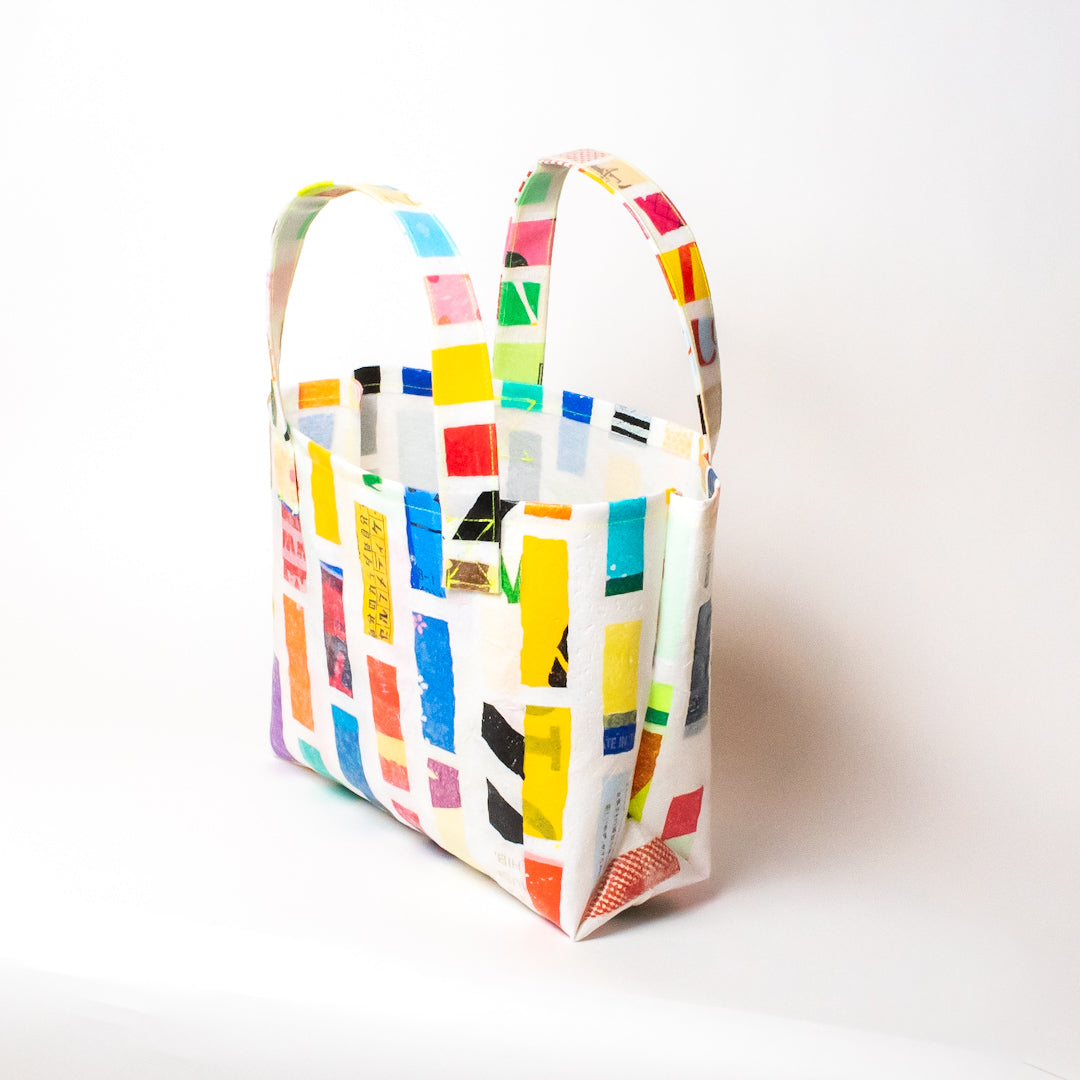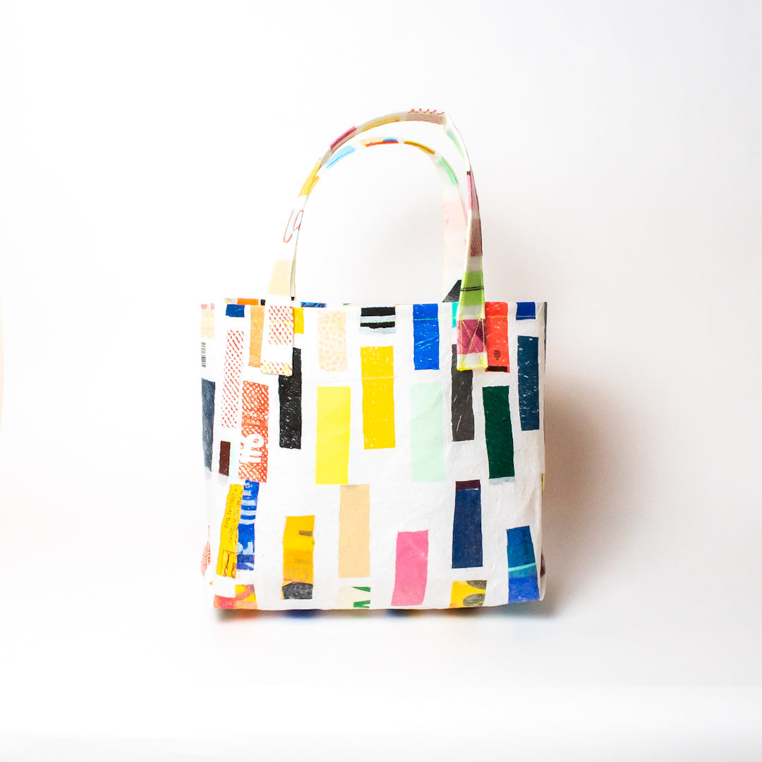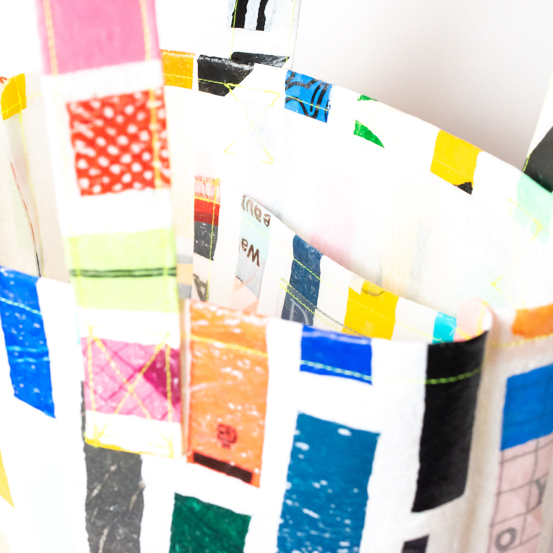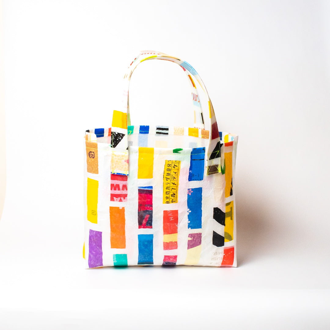 poRiffの主な材料は買い物したときにもらう買い物袋です。一見捨ててしまうような買い物袋たちをコラージュし、熱で圧着して完成するシートを使用してプロダクトに変えています。