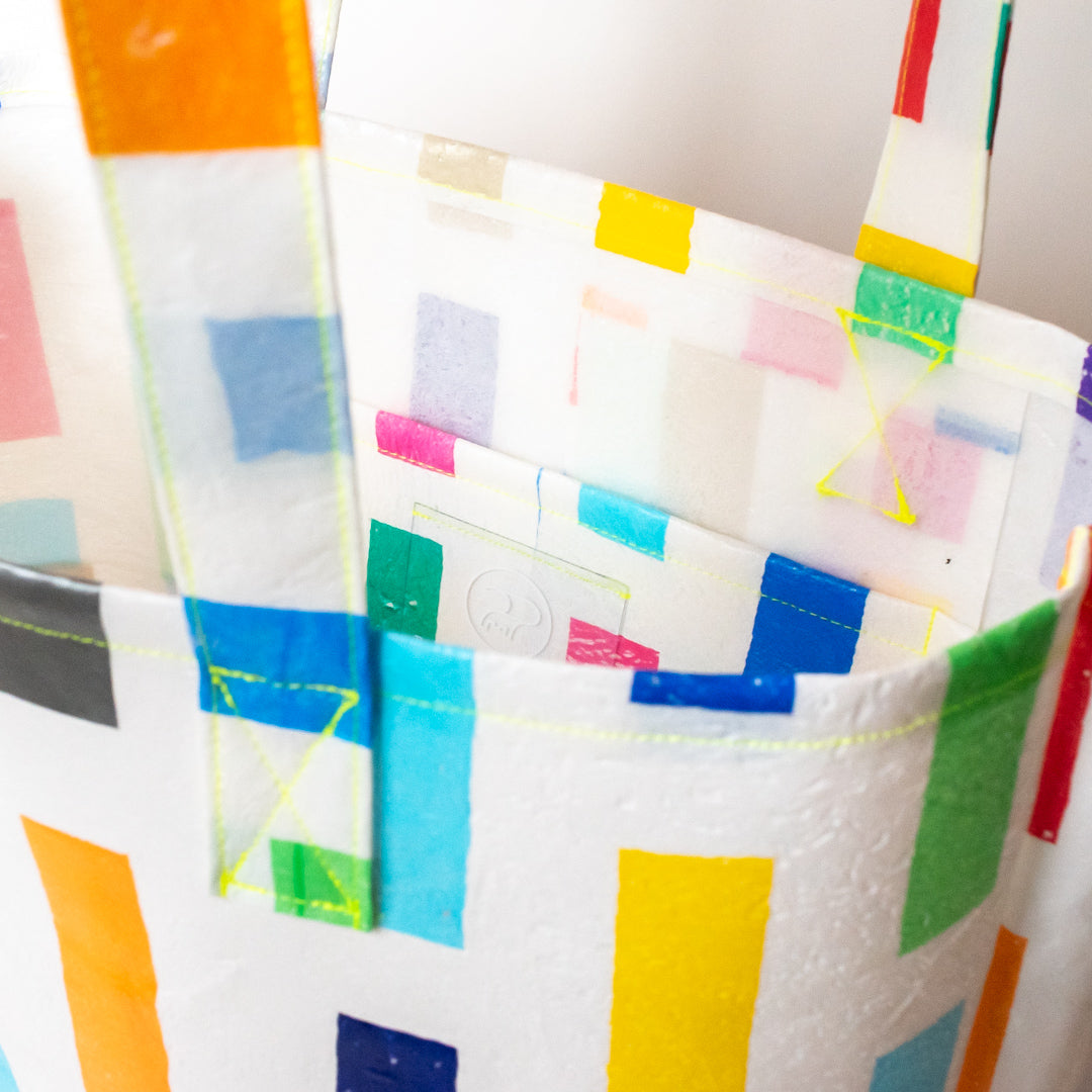 poRiffの主な材料は買い物したときにもらう買い物袋です。一見捨ててしまうような買い物袋たちをコラージュし、熱で圧着して完成するシートを使用してプロダクトに変えています。