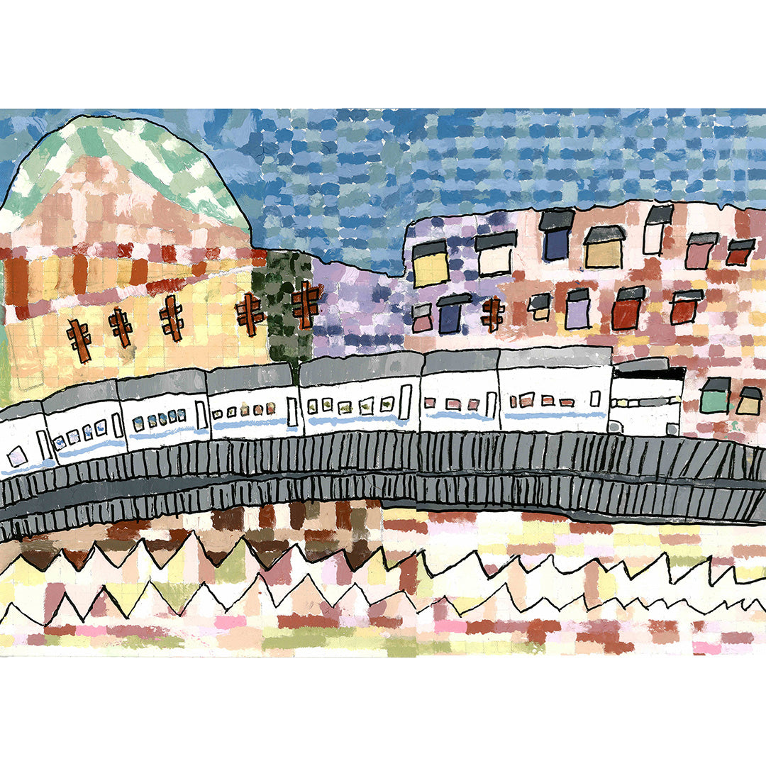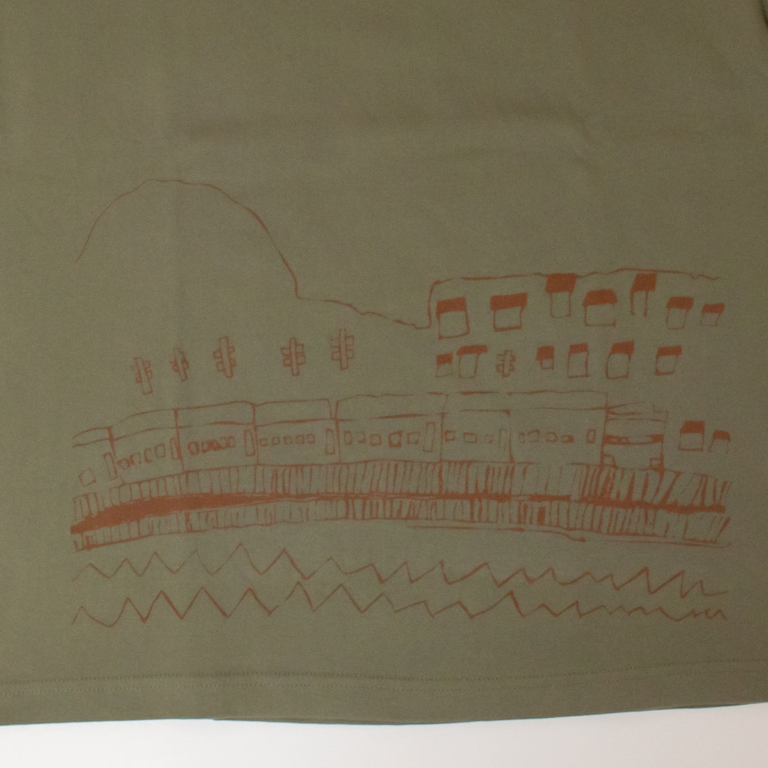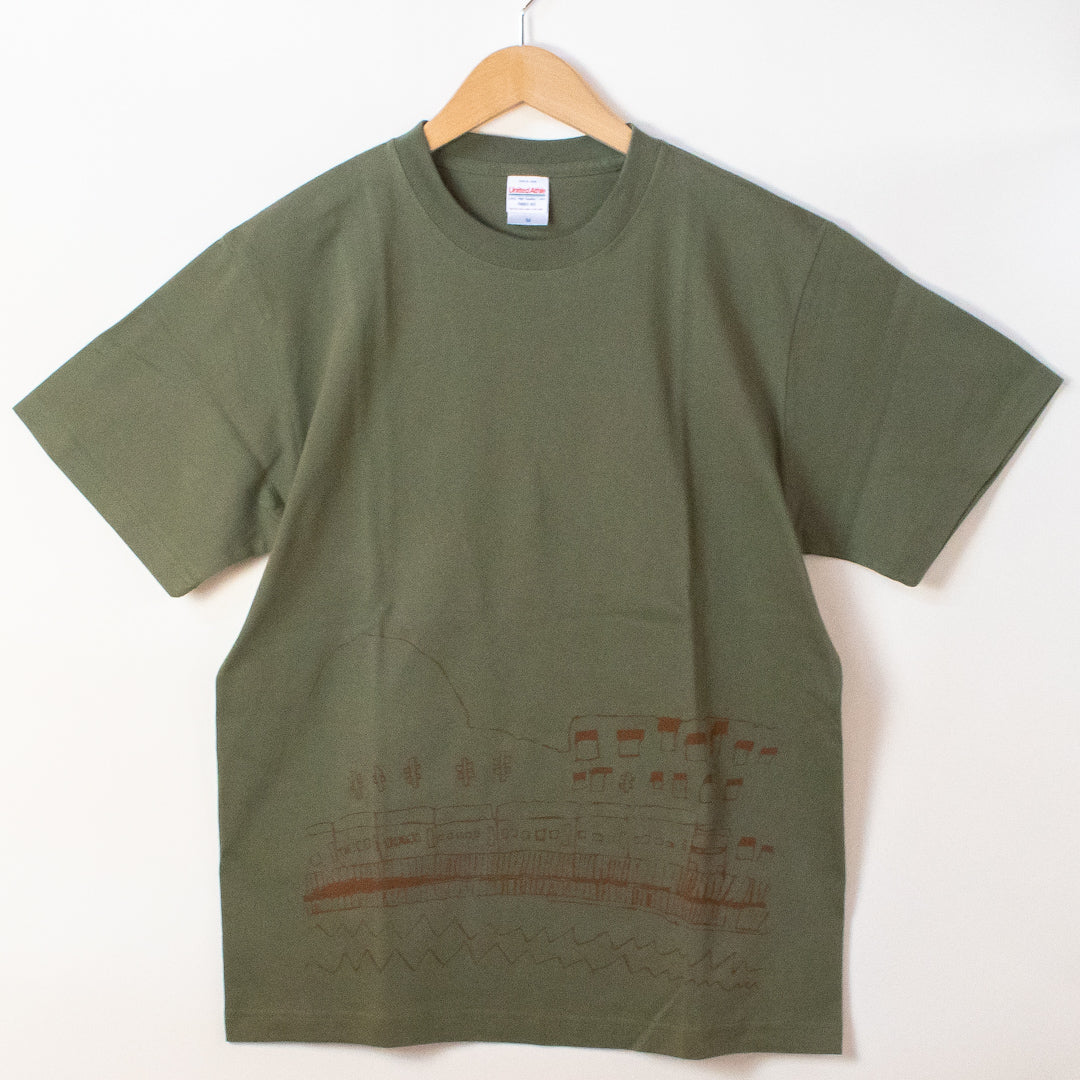 サンダーバードを愛する真理子さんイチオシの景色。琵琶湖と比良山を背景にサンダーバードが走り抜けます。点在する家々や電柱がのどかな景色を引き立てるおしゃれな一枚になりました。Tシャツの下部分にデザインが刷られており、バックプリントも作りましたので、さりげなくアートを身につけたい方にもおすすめです!