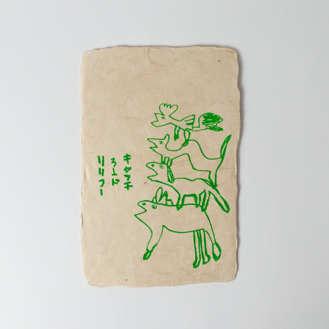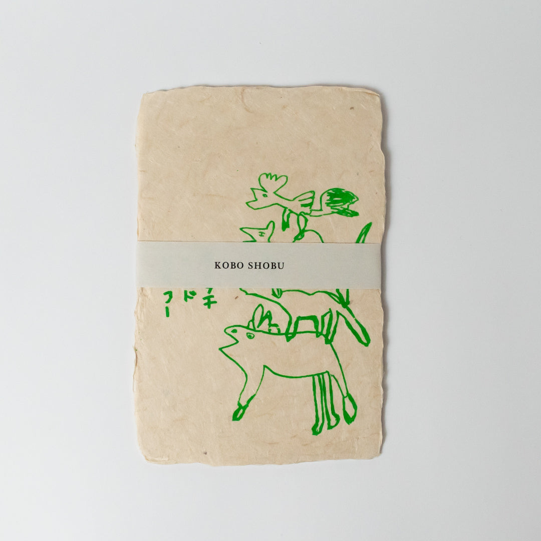 手すき紙にシルクスクリーンでデザイン画を施したはがきです。温かみのある手すき紙とデザイン画の無邪気さがほっこりさせてくれます。