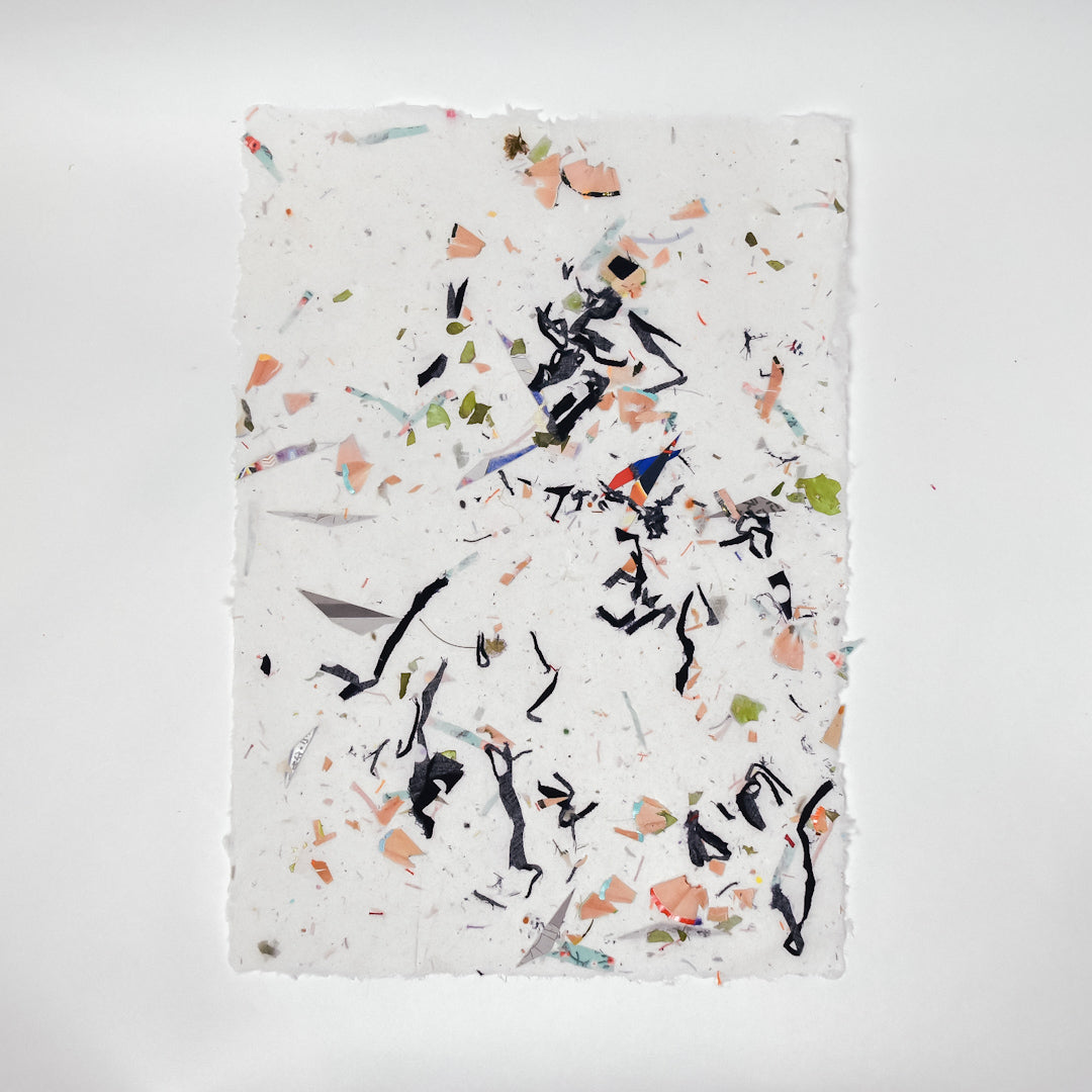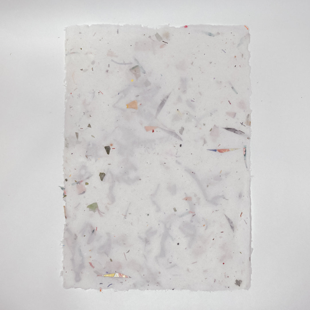 しのぶさんが作るオリジナル紙漉き製品です。草の葉や種、鉛筆削りで出たカラフルなやつ、包装紙の切れ端...季節や気分のネタを入れて、自由に製作しています。