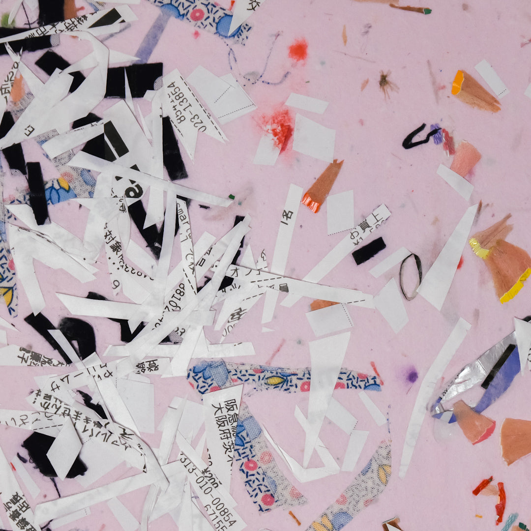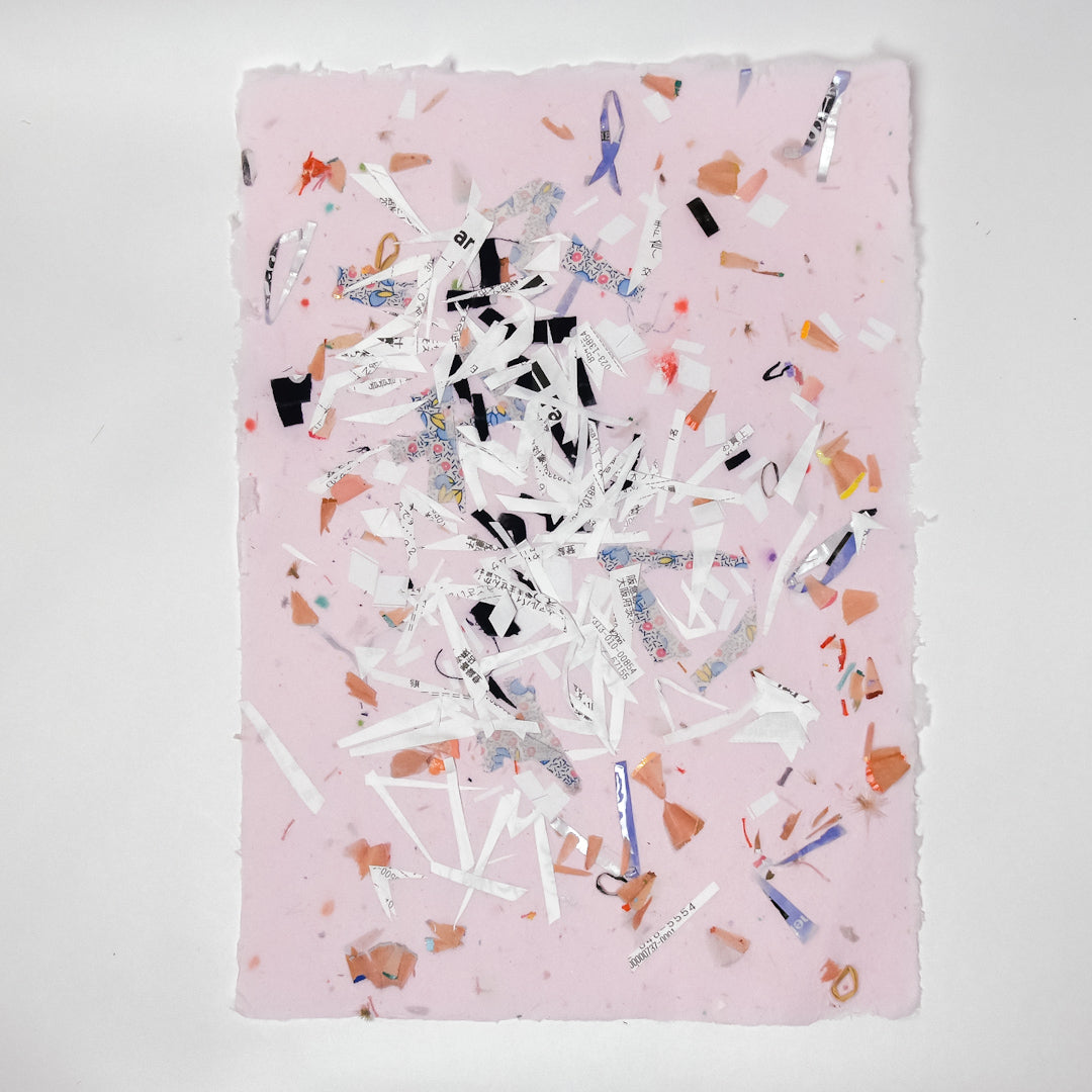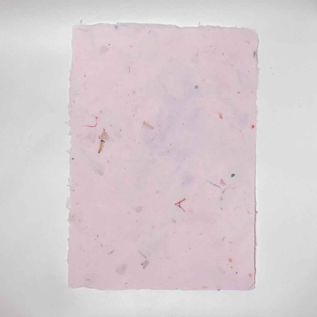 しのぶさんが作るオリジナル紙漉き製品です。草の葉や種、鉛筆削りで出たカラフルなやつ、包装紙の切れ端...季節や気分のネタを入れて、自由に製作しています。