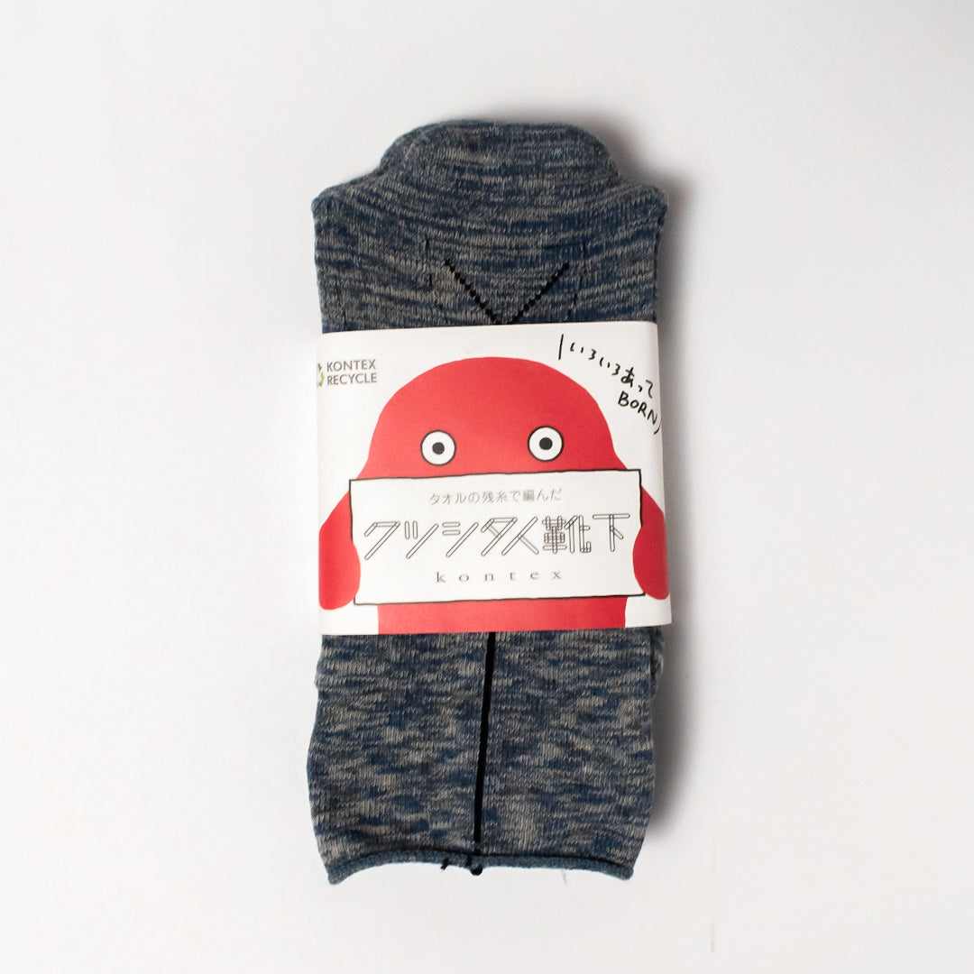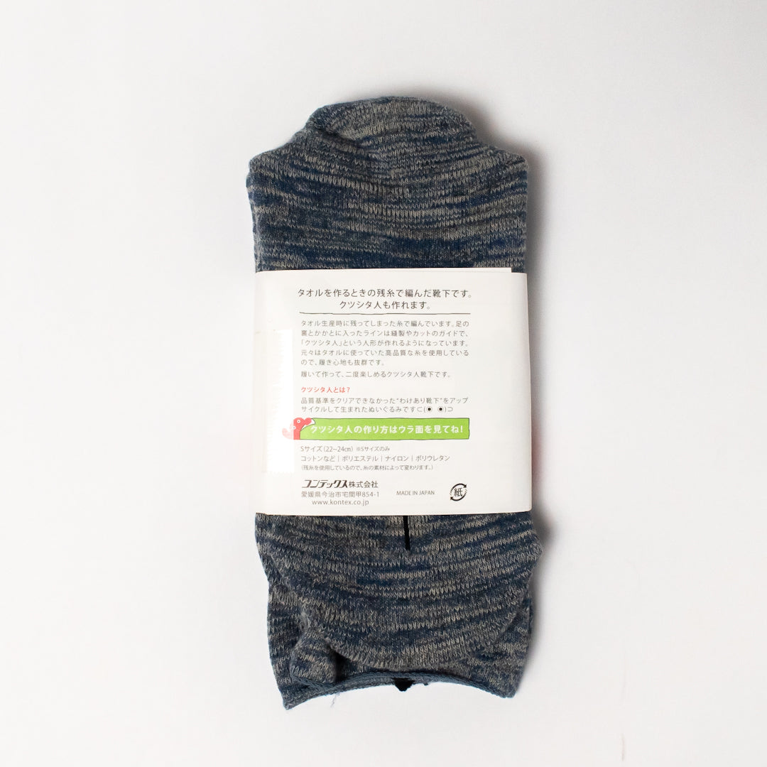 タオル生産時に残ってしまった糸で編んでいます。足の裏とかかとに入ったラインは縫製やカットのガイドで、「クツシタ人」という人形を作れるようになっています。