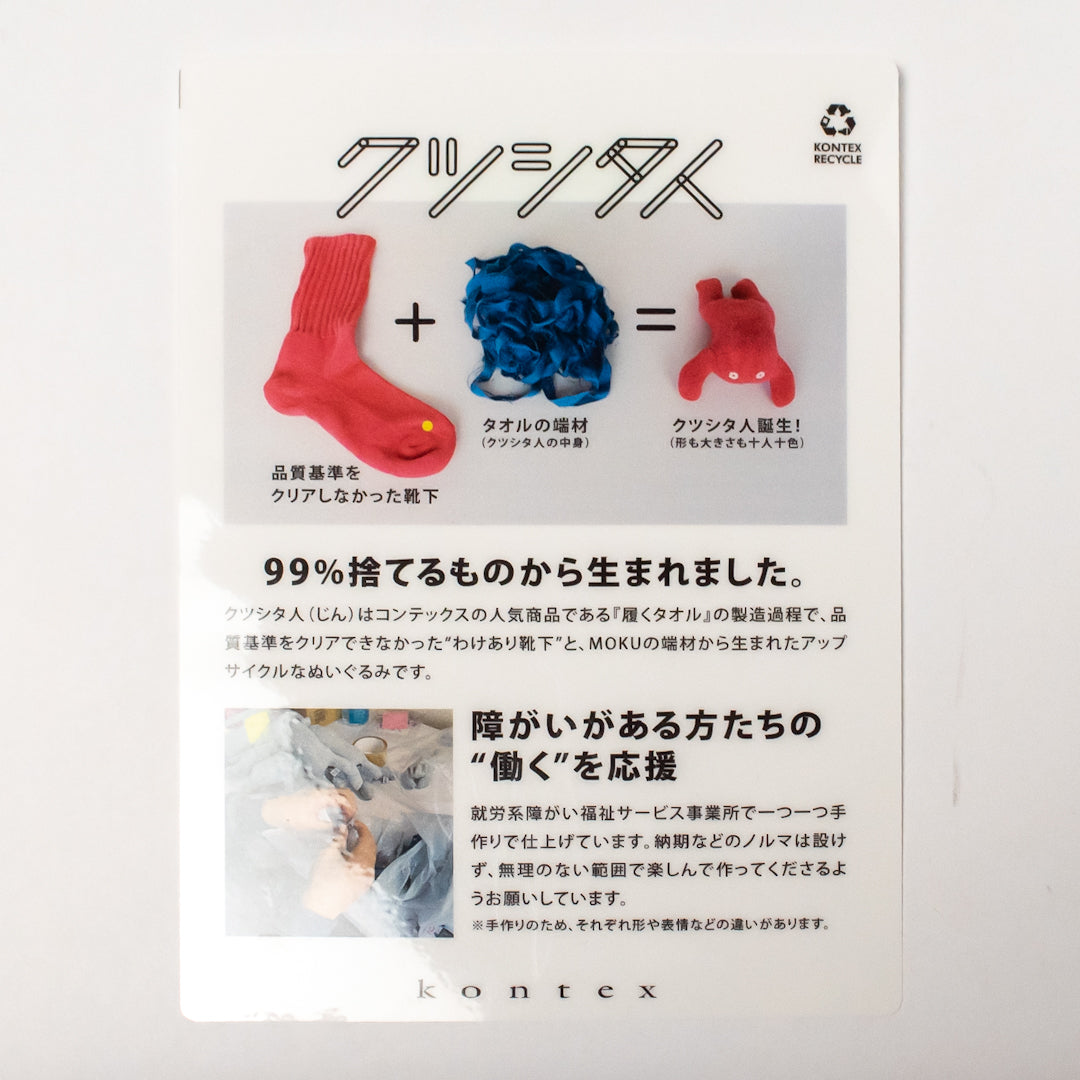 kontexは、愛媛県の今治で1934年に創業。タオルなどの製造を行っている会社です。クツシタ人の制作には、就労系の障がいサービス事業所で一つ一つ手作りで仕上げています。