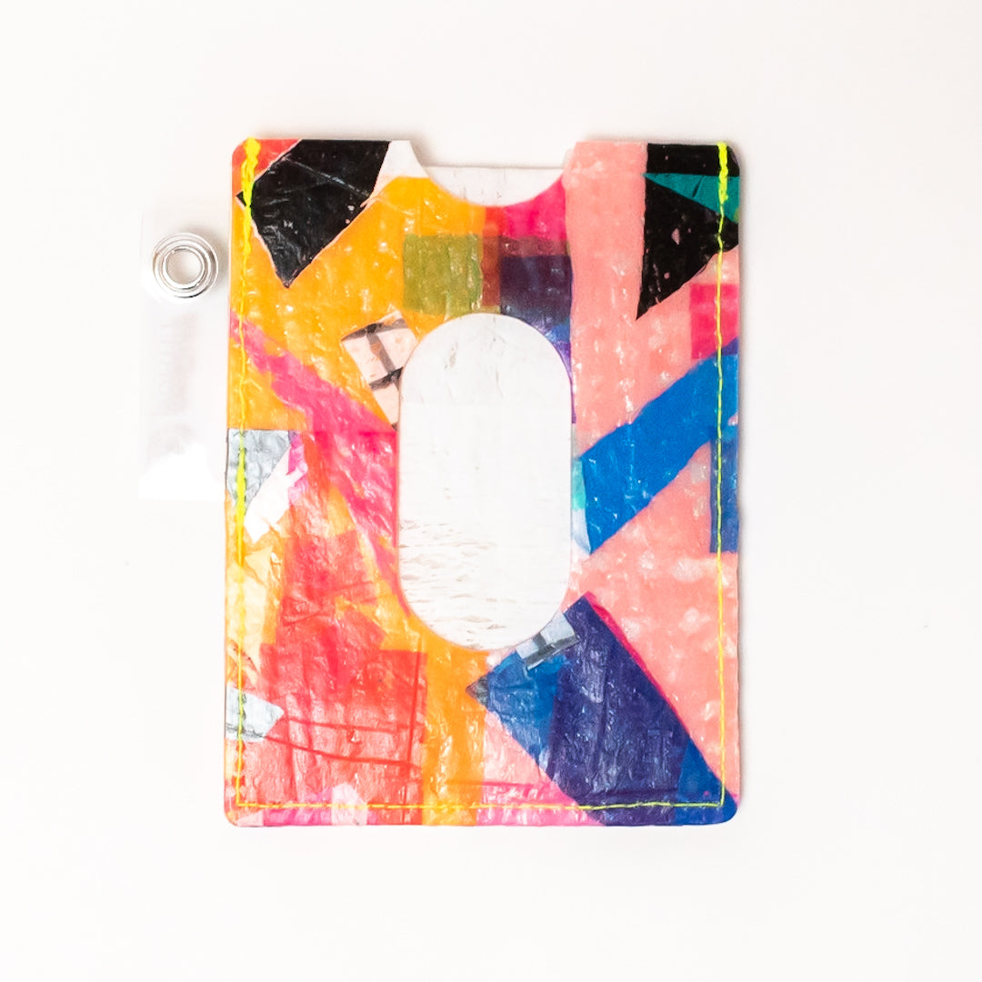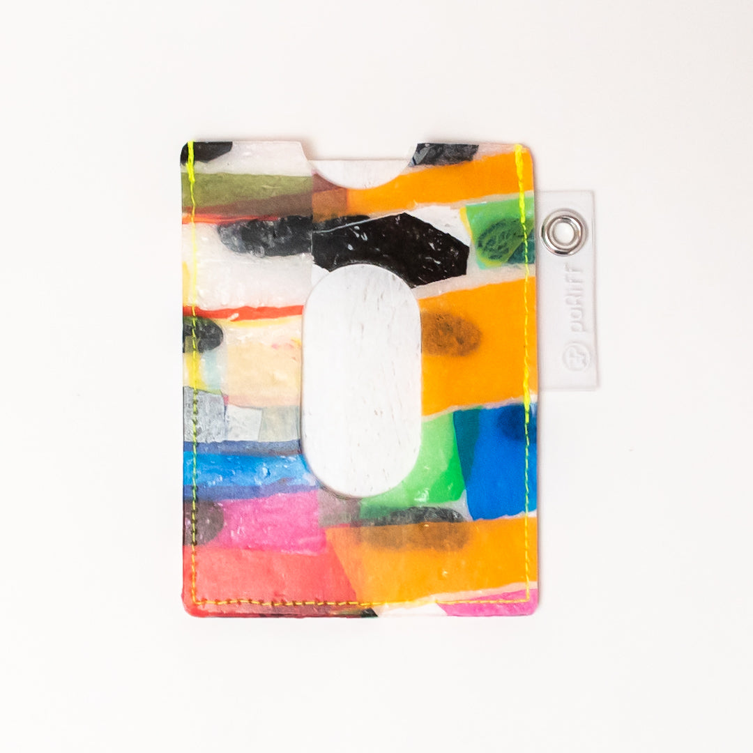カラフルな柄のパスケースです。ひとつひとつ柄が違うので、お好きなモノを選んでください。裏、表にカードを入れられるので、2枚収納できます。