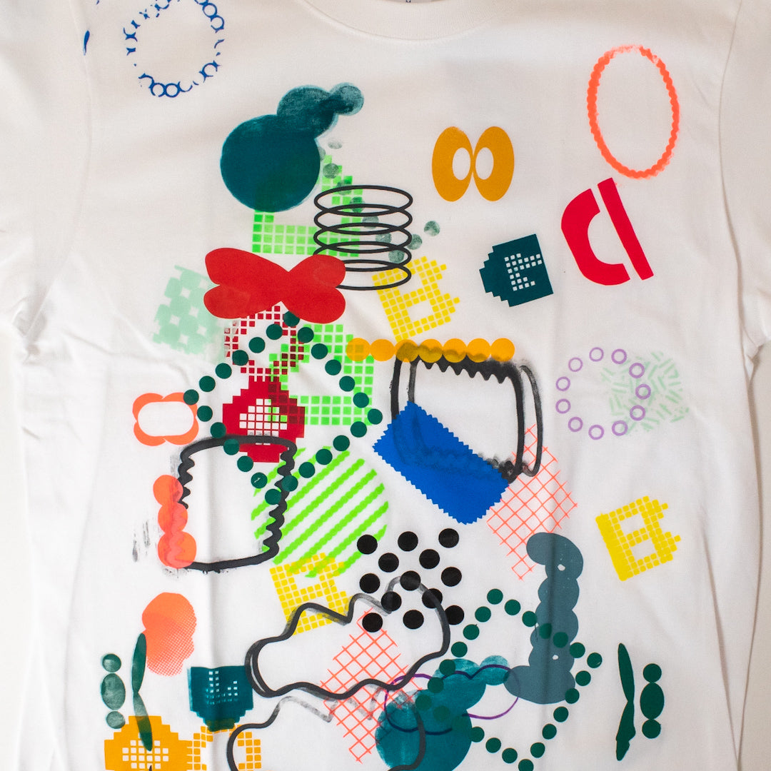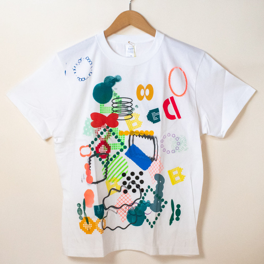 Good Job!センターのメンバーとスタッフが、小さなシルクスクリーンの版とインクの色を選び、机の上に並べられたTシャツや布などの上に自由にプリントをし、それら全てを商品として販売しています。