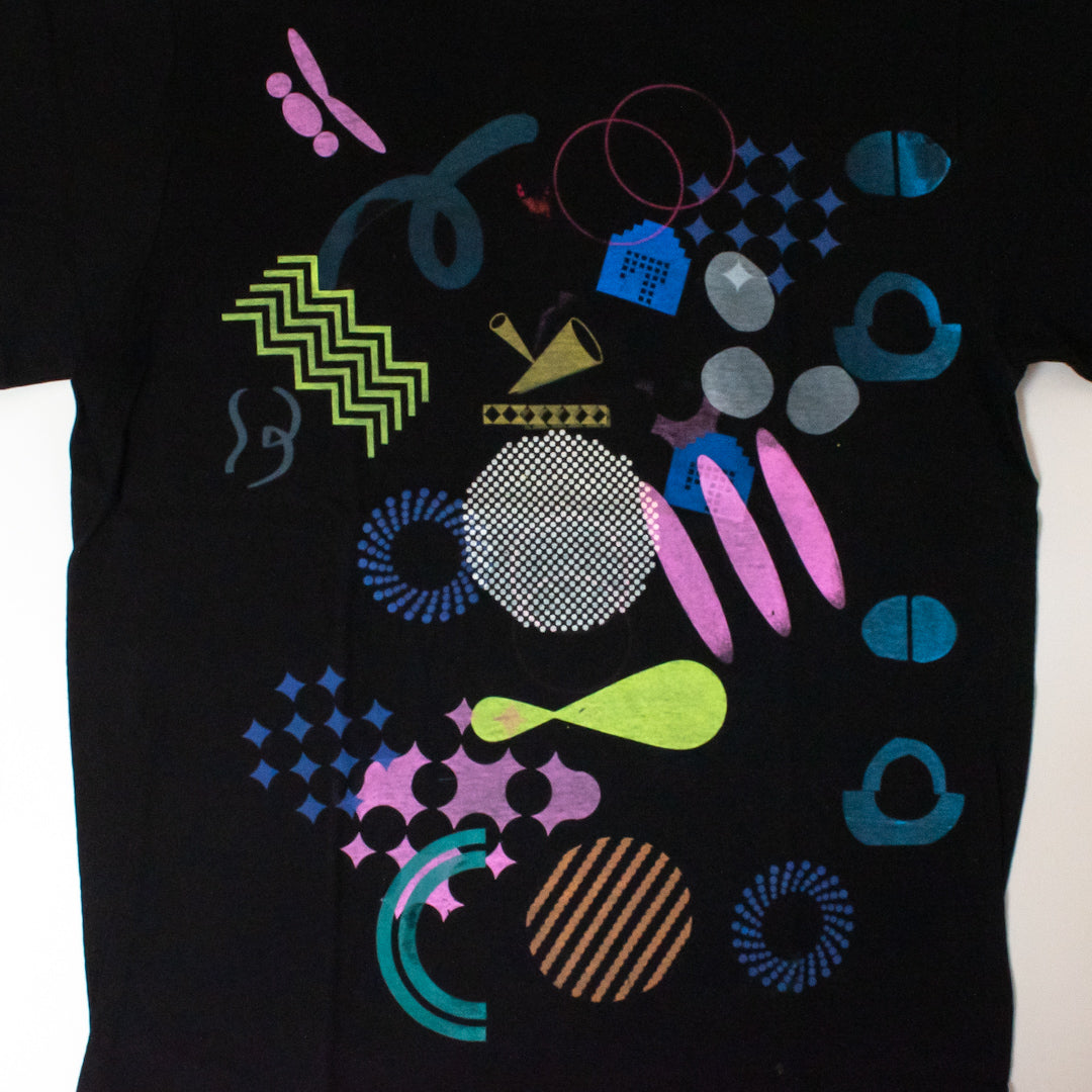 Good Job!センターのメンバーとスタッフが、小さなシルクスクリーンの版とインクの色を選び、机の上に並べられたTシャツや布などの上に自由にプリントをし、それら全てを商品として販売しています。