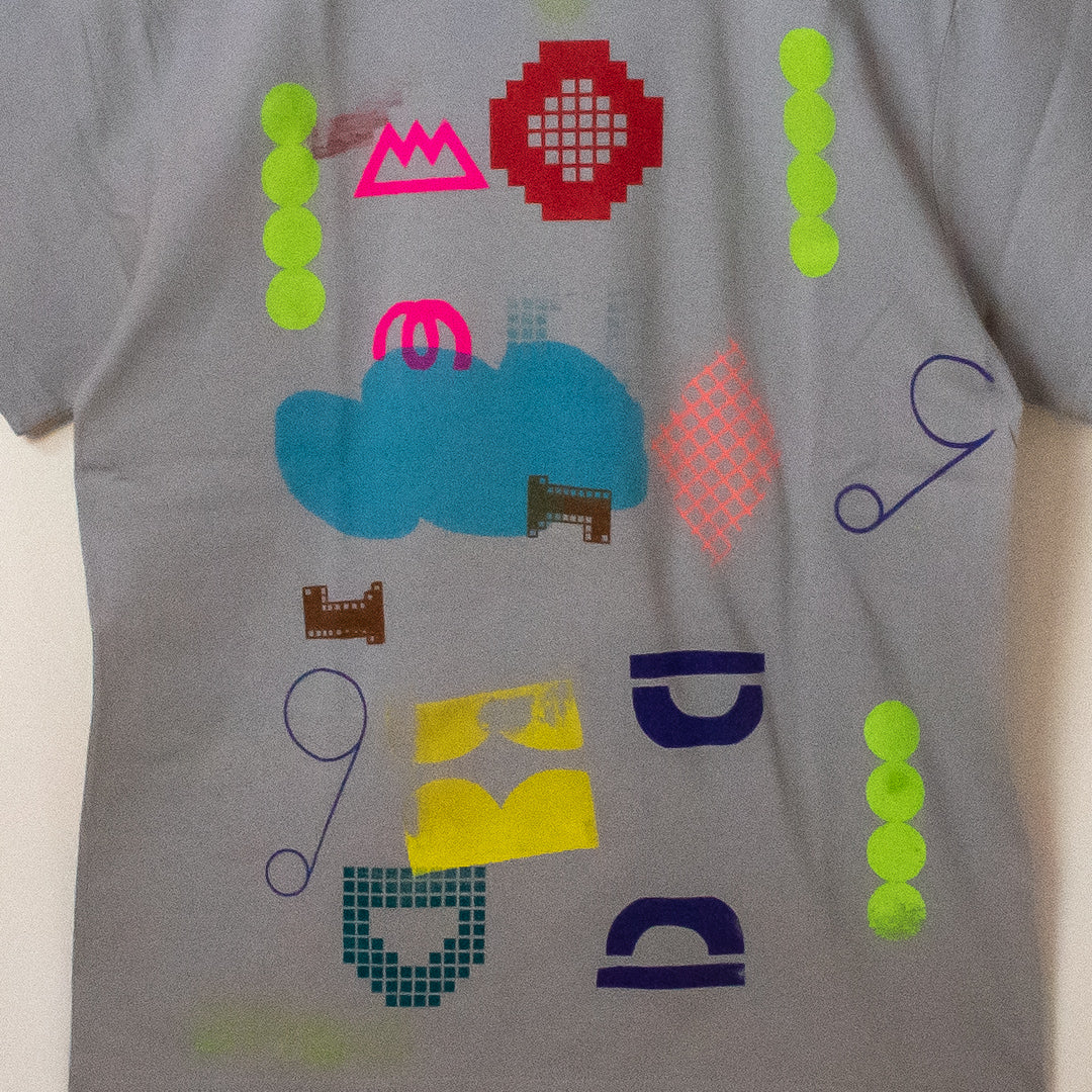 Good Job!センターのメンバーとスタッフが、小さなシルクスクリーンの版とインクの色を選び、机の上に並べられたTシャツや布などの上に自由にプリントをし、それら全てを商品として販売しています。