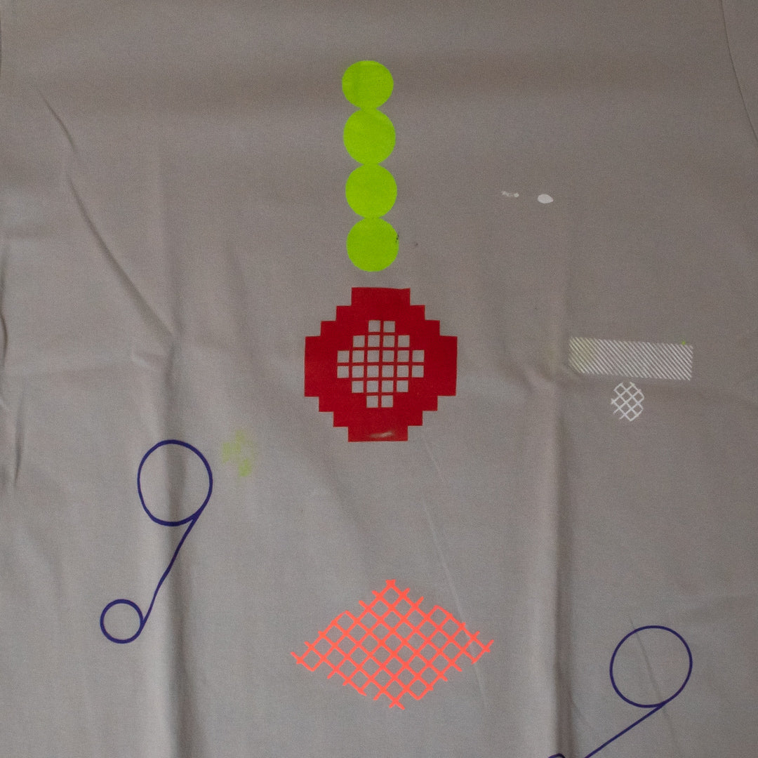 Good Job!センターのメンバーとスタッフが、小さなシルクスクリーンの版とインクの色を選び、机の上に並べられたTシャツや布などの上に自由にプリントをし、それら全てを商品として販売しています。