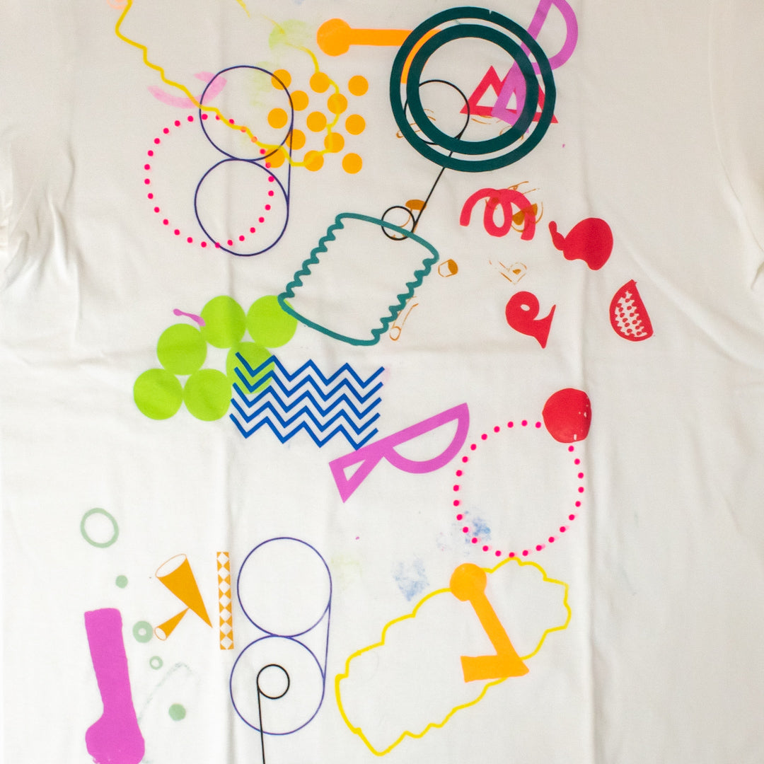 Good Job!センターのメンバーとスタッフが、小さなシルクスクリーンの版とインクの色を選び、机の上に並べられたTシャツや布などの上に自由にプリントをし、それら全てを商品として販売しています。