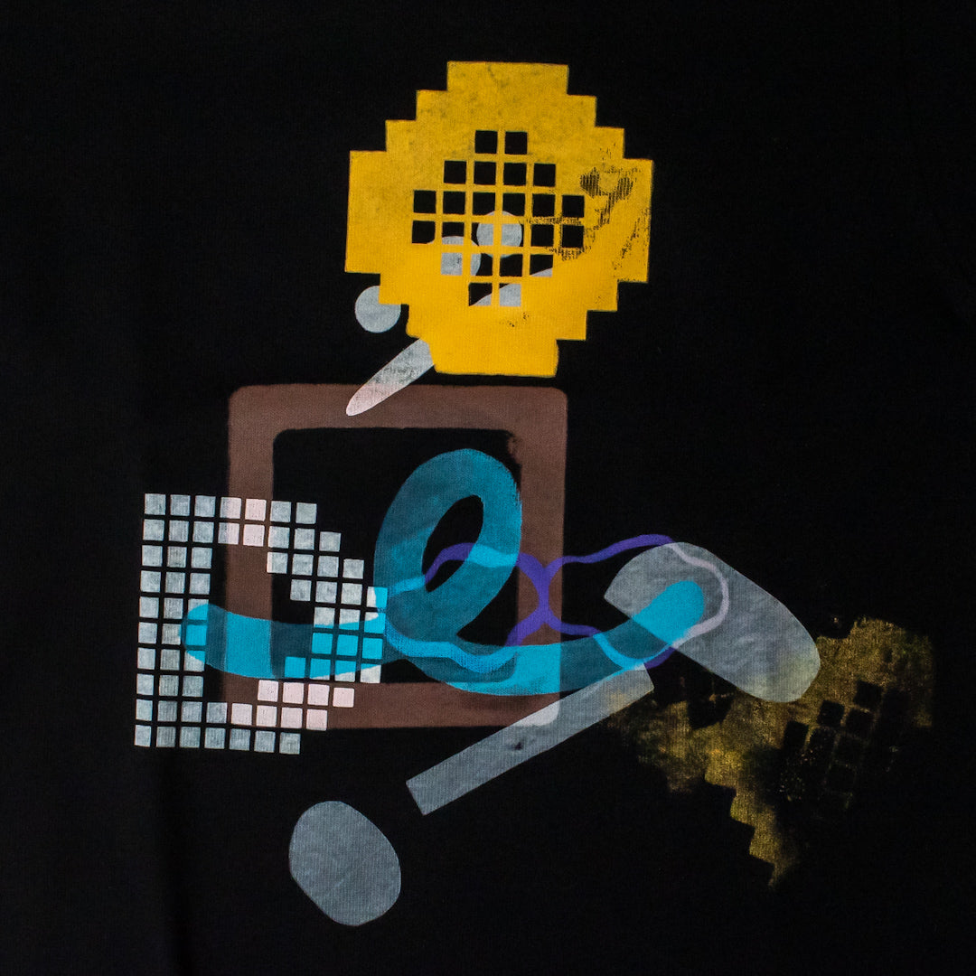 Good Job!センターのメンバーとスタッフが、小さなシルクスクリーンの版とインクの色を選び、机の上に並べられたTシャツや布などの上に自由にプリントをし、それら全てを商品として販売しています。