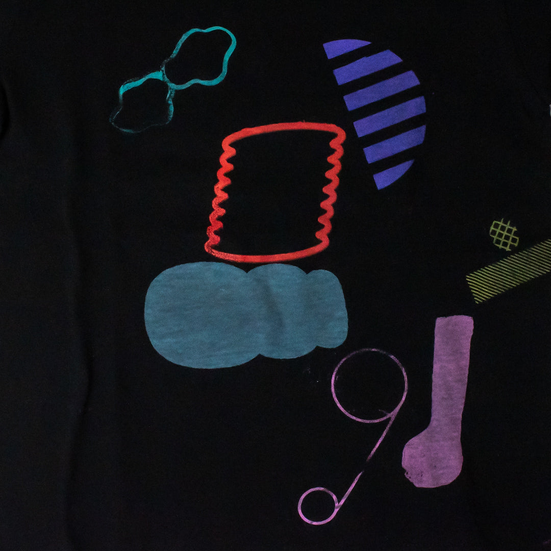 Good Job!センターのメンバーとスタッフが、小さなシルクスクリーンの版とインクの色を選び、机の上に並べられたTシャツや布などの上に自由にプリントをし、それら全てを商品として販売しています。