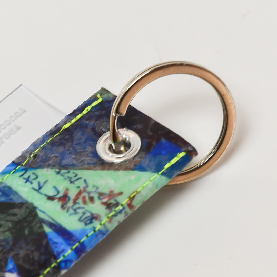 一見捨ててしまうような買い物袋たちをコラージュし、熱で圧着して完成するシートを使用してプロダクトに変えています。