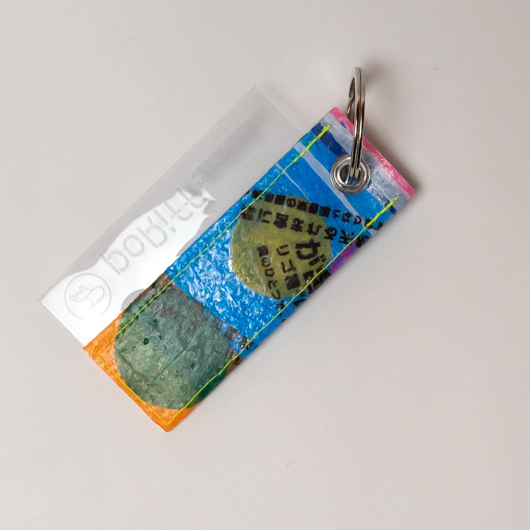 一見捨ててしまうような買い物袋たちをコラージュし、熱で圧着して完成するシートを使用してプロダクトに変えています。