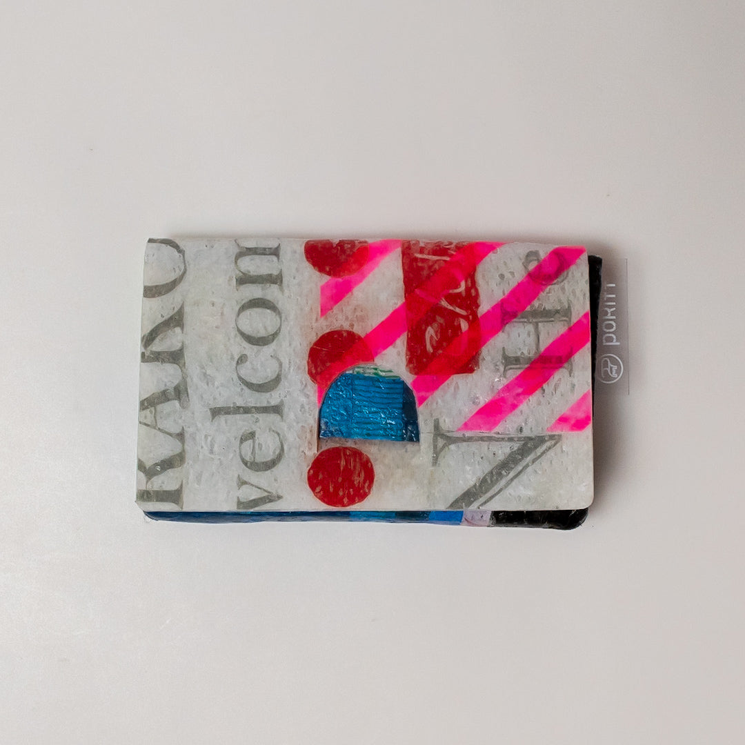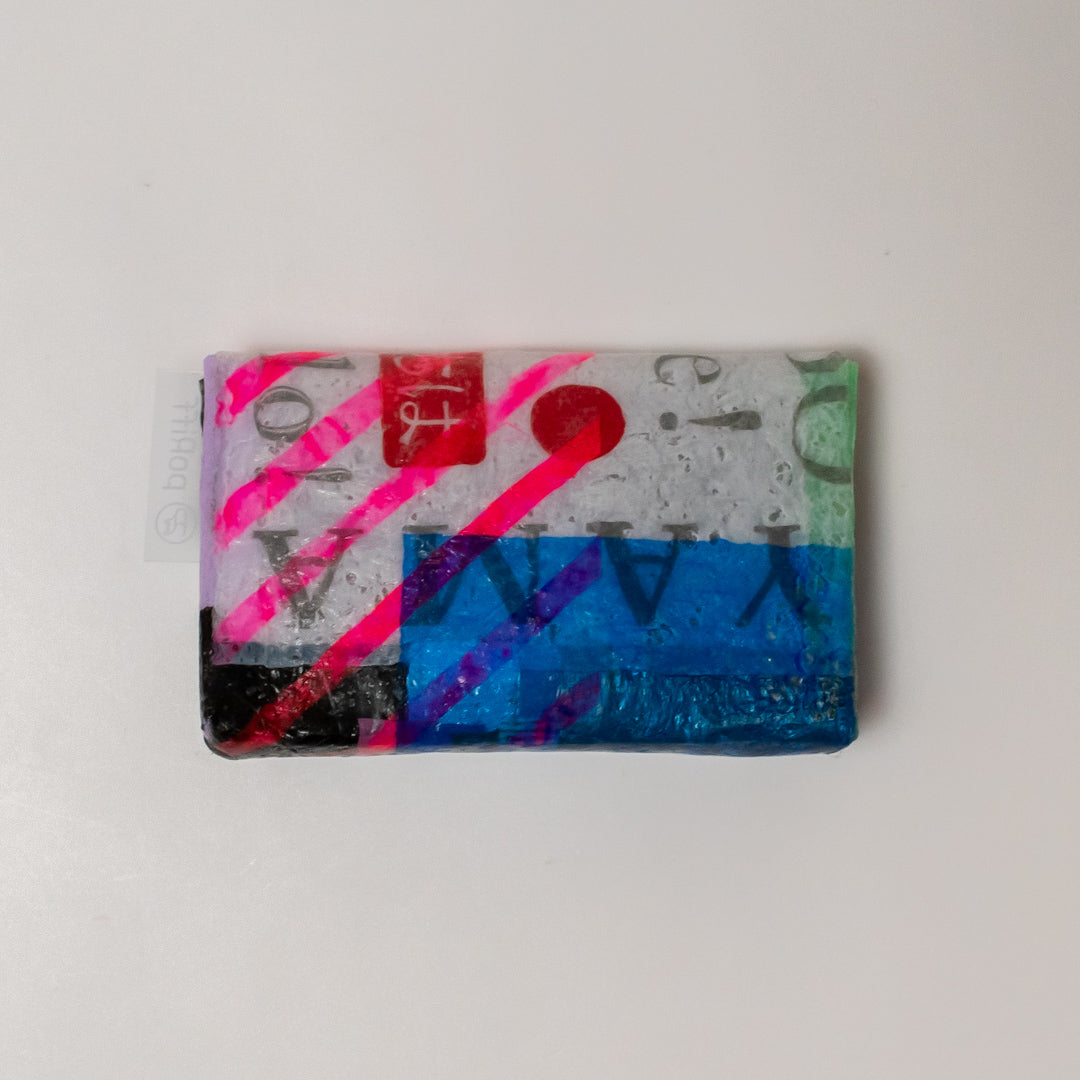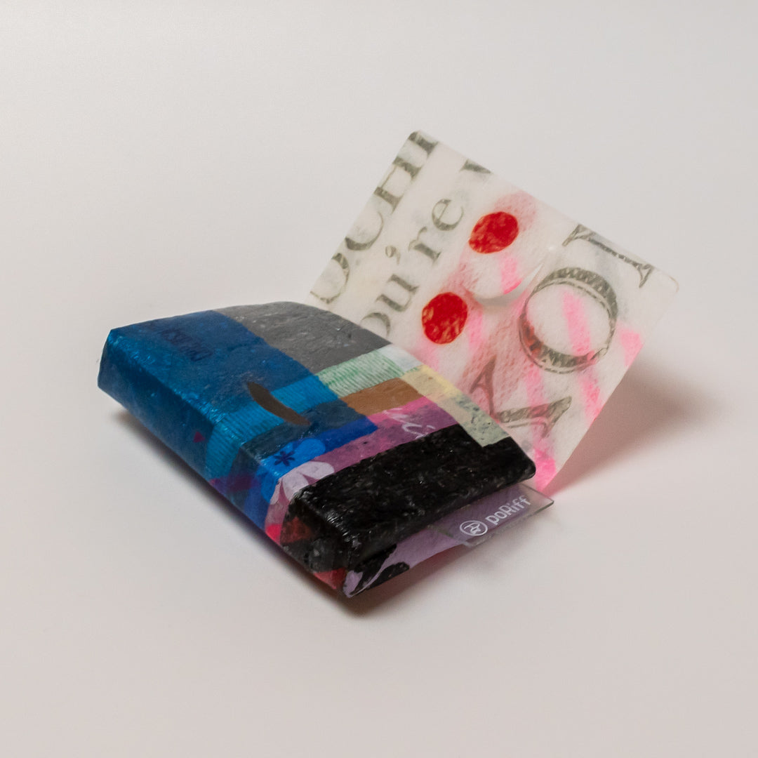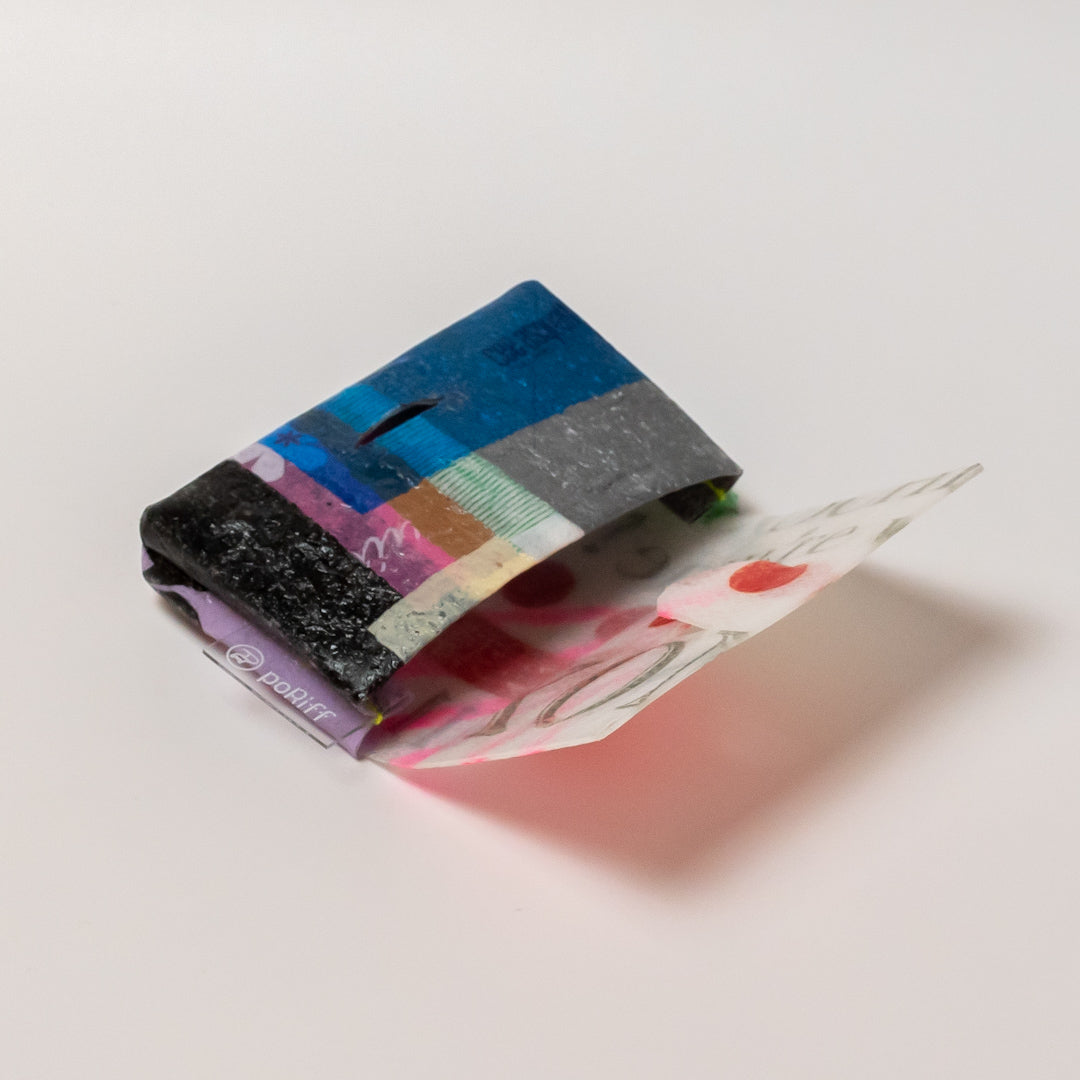 poRiffの主な材料は買い物したときにもらう買い物袋です。一見捨ててしまうような買い物袋たちをコラージュし、熱で圧着して完成するシートを使用してプロダクトに変えています。カラーはすべて買い物袋そのままの色。着色は一切していません。