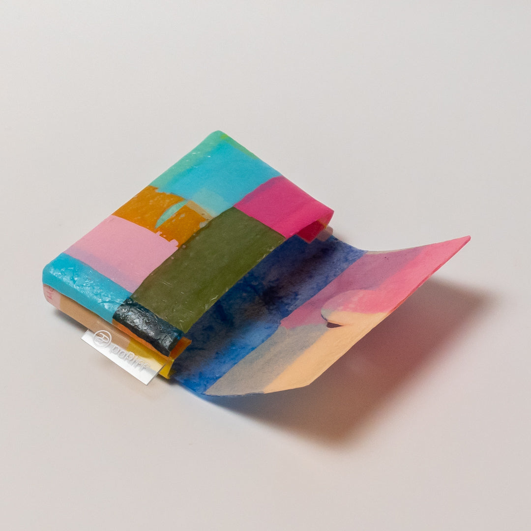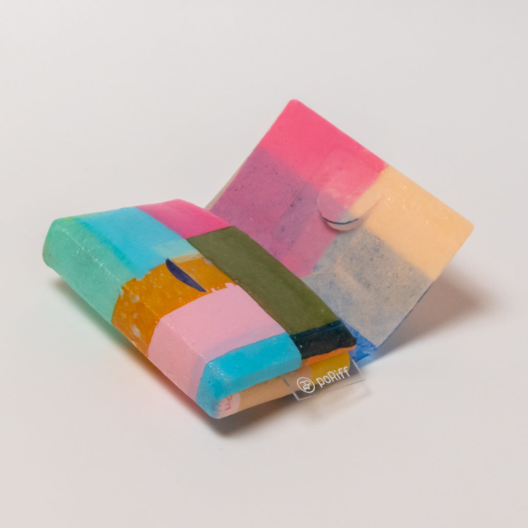 poRiffの主な材料は買い物したときにもらう買い物袋です。一見捨ててしまうような買い物袋たちをコラージュし、熱で圧着して完成するシートを使用してプロダクトに変えています。カラーはすべて買い物袋そのままの色。着色は一切していません。