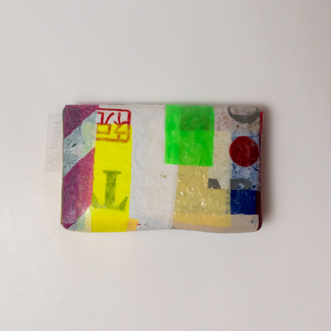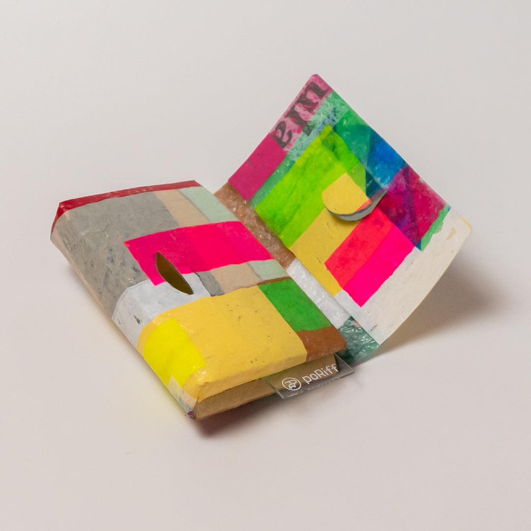 poRiffの主な材料は買い物したときにもらう買い物袋です。一見捨ててしまうような買い物袋たちをコラージュし、熱で圧着して完成するシートを使用してプロダクトに変えています。カラーはすべて買い物袋そのままの色。着色は一切していません。