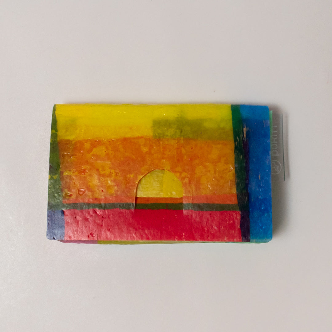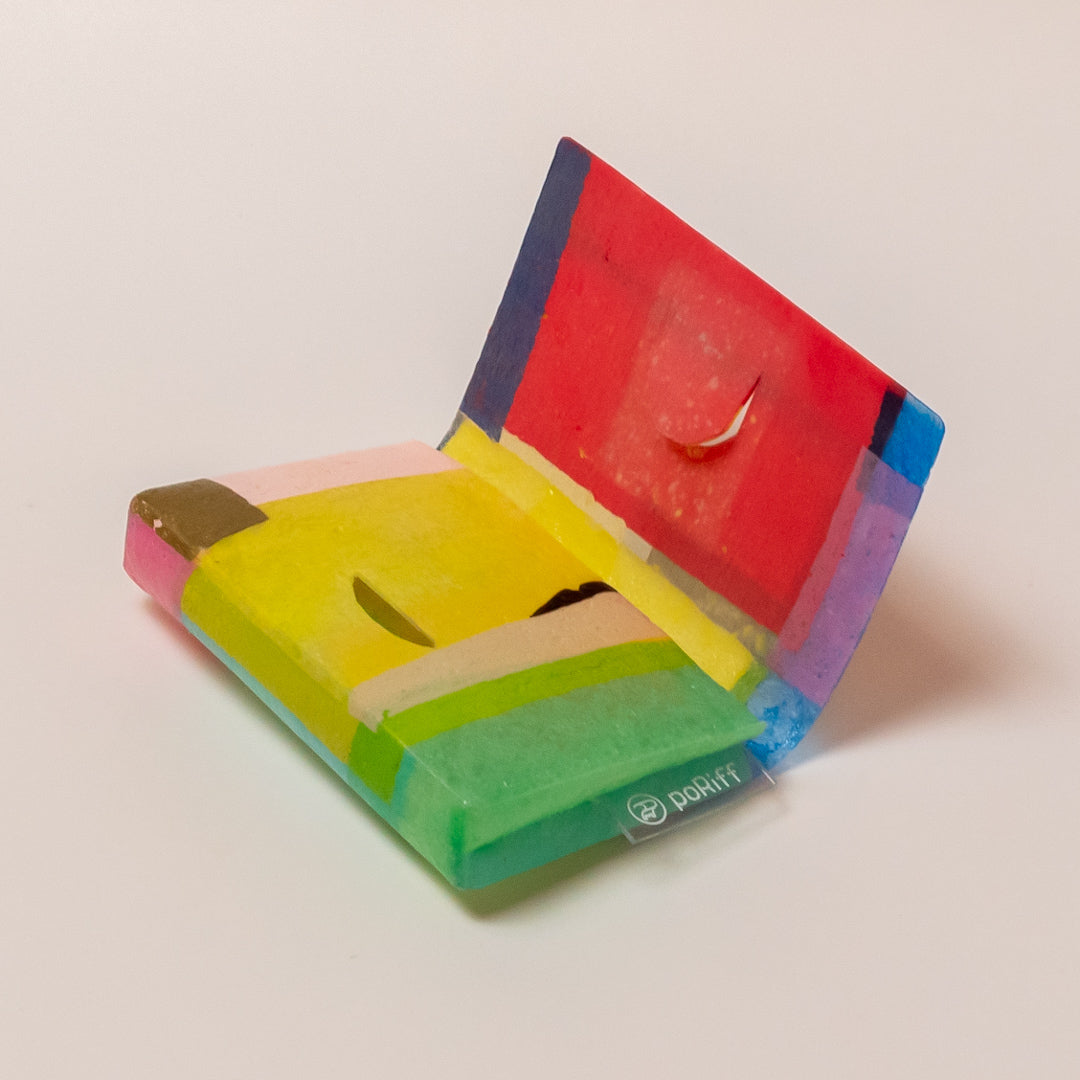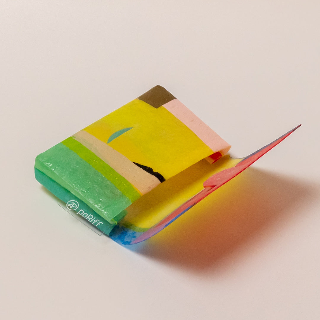 poRiffの主な材料は買い物したときにもらう買い物袋です。一見捨ててしまうような買い物袋たちをコラージュし、熱で圧着して完成するシートを使用してプロダクトに変えています。カラーはすべて買い物袋そのままの色。着色は一切していません。