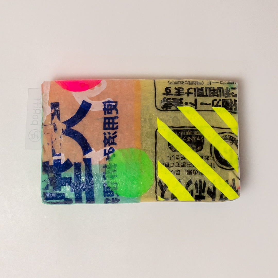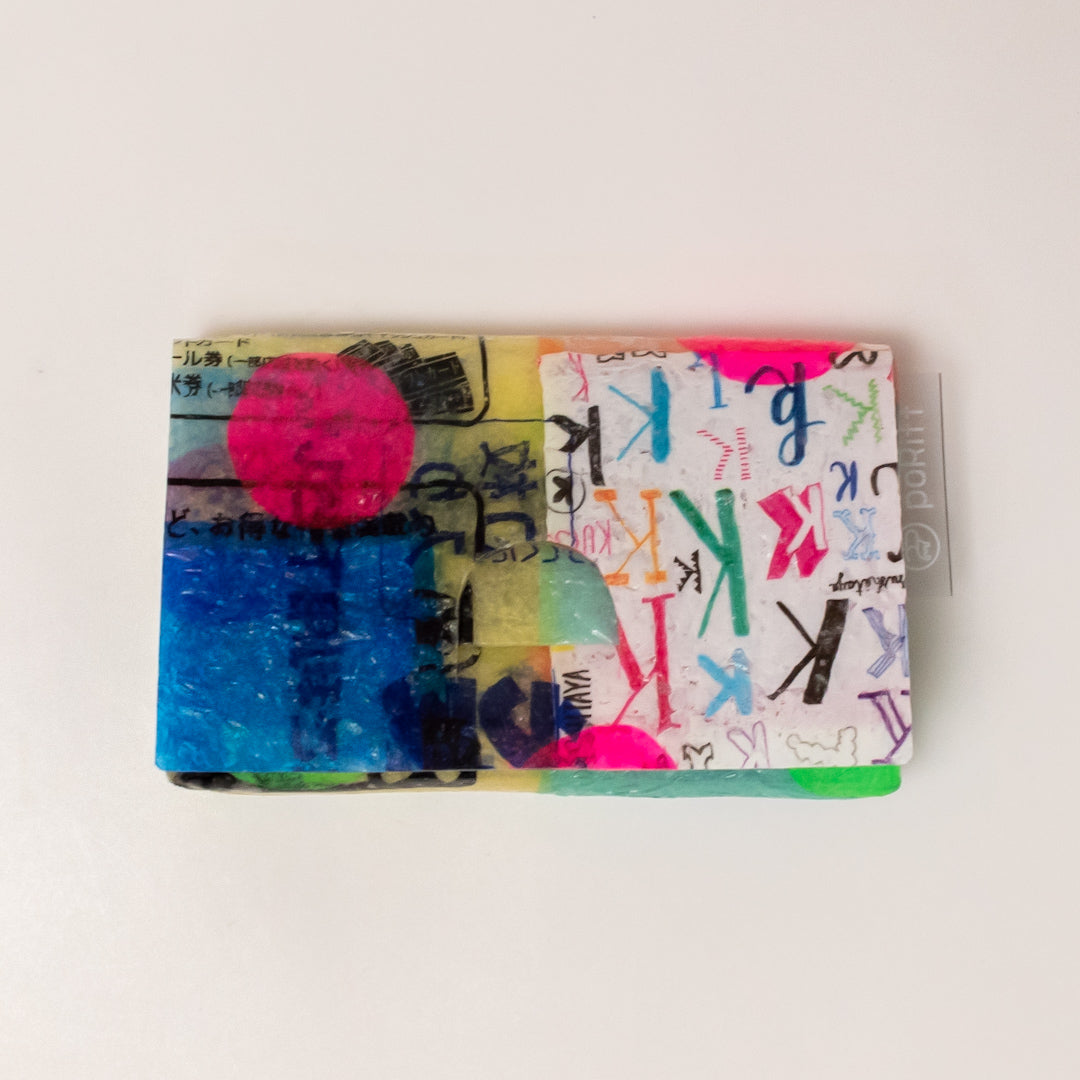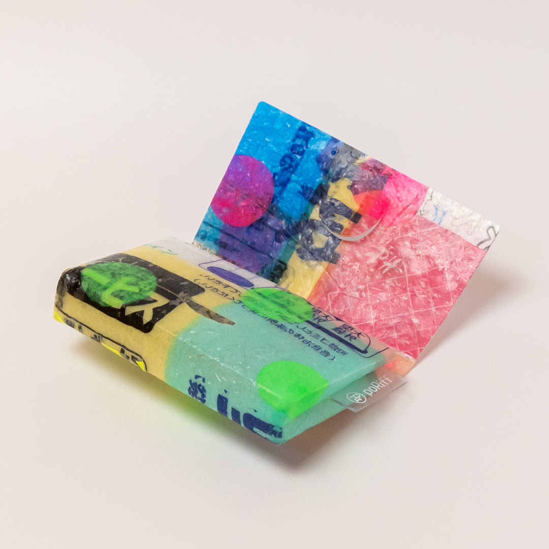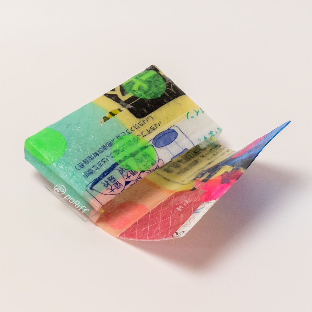 poRiffの主な材料は買い物したときにもらう買い物袋です。一見捨ててしまうような買い物袋たちをコラージュし、熱で圧着して完成するシートを使用してプロダクトに変えています。カラーはすべて買い物袋そのままの色。着色は一切していません。