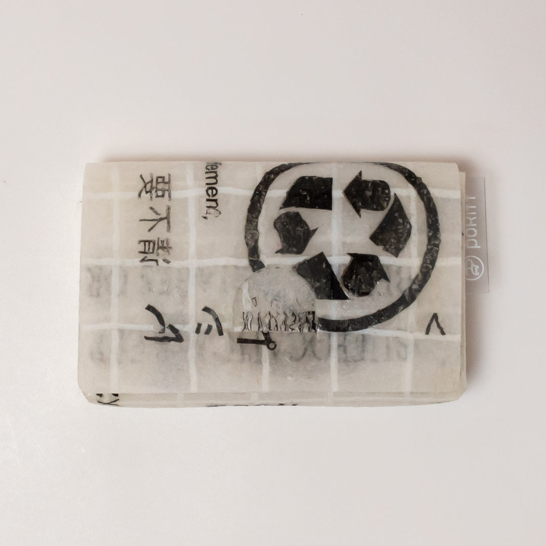 poRiffの主な材料は買い物したときにもらう買い物袋です。一見捨ててしまうような買い物袋たちをコラージュし、熱で圧着して完成するシートを使用してプロダクトに変えています。カラーはすべて買い物袋そのままの色。着色は一切していません。