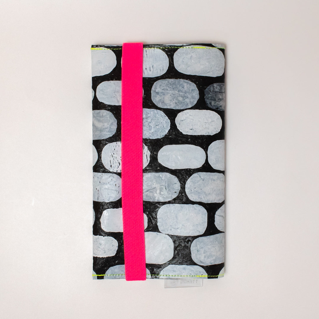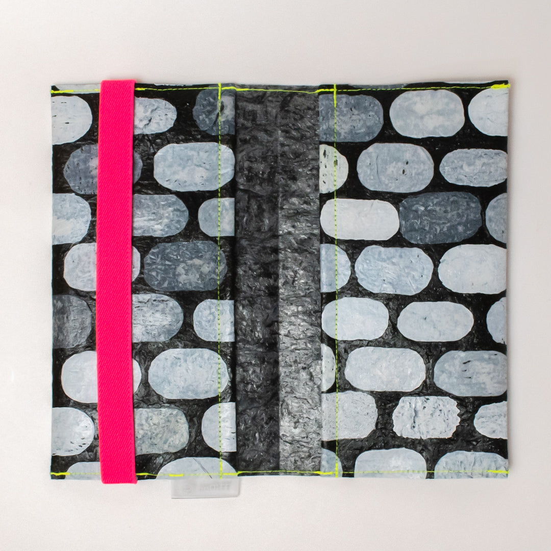 一見捨ててしまうような買い物袋たちをコラージュし、熱で圧着して完成するシートを使用してプロダクトに変えています。