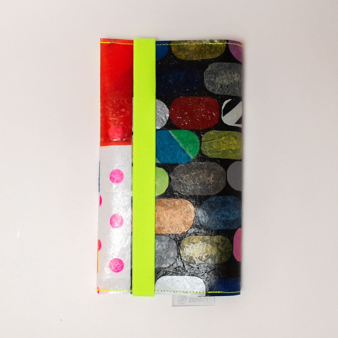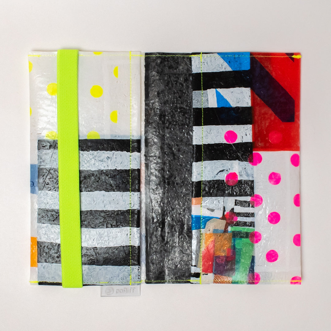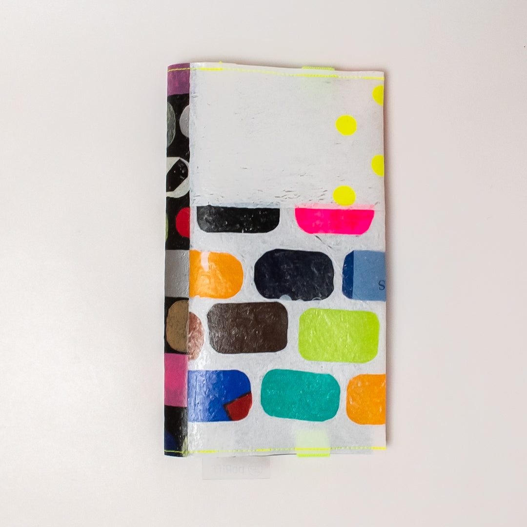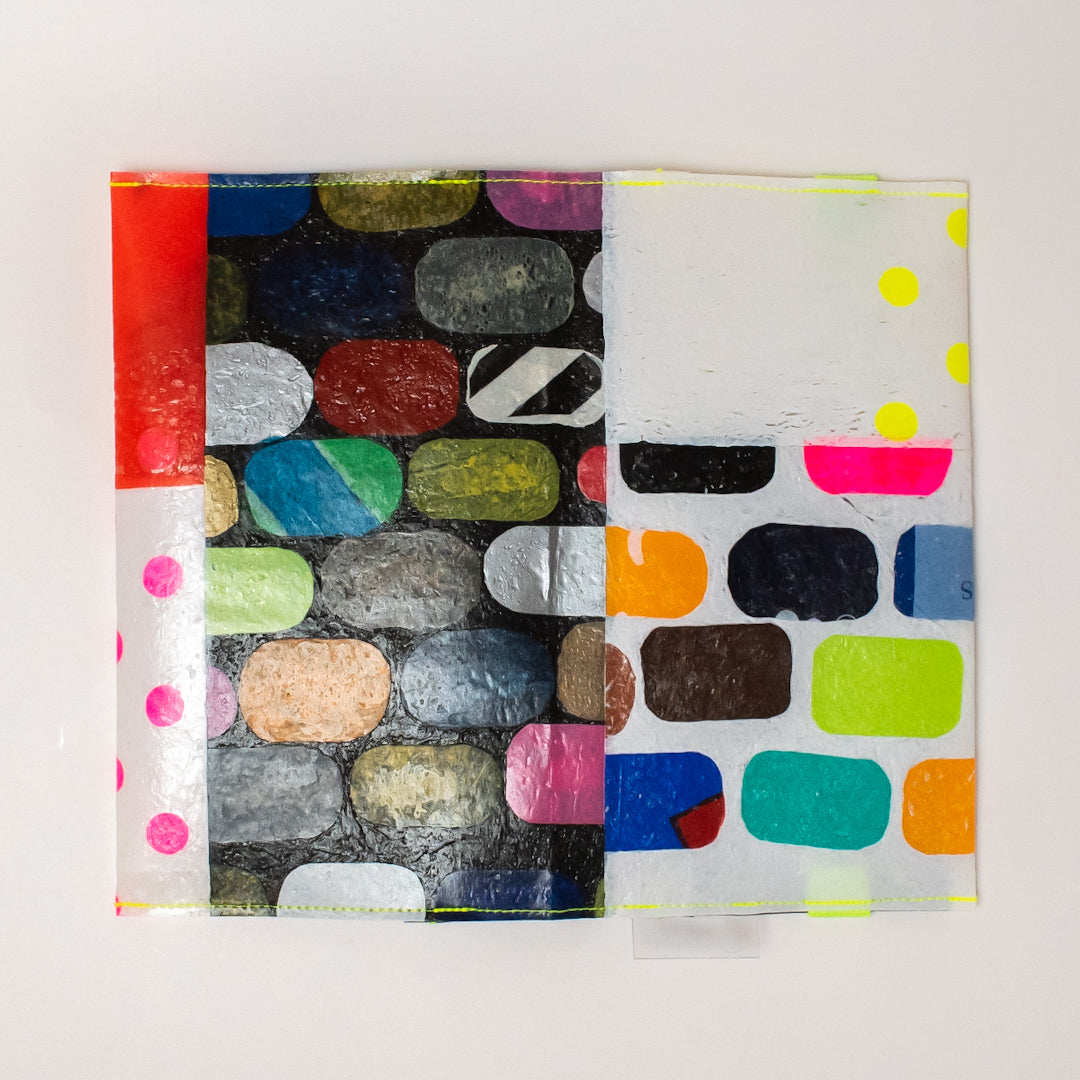 一見捨ててしまうような買い物袋たちをコラージュし、熱で圧着して完成するシートを使用してプロダクトに変えています。