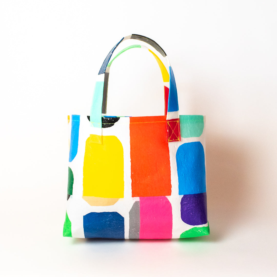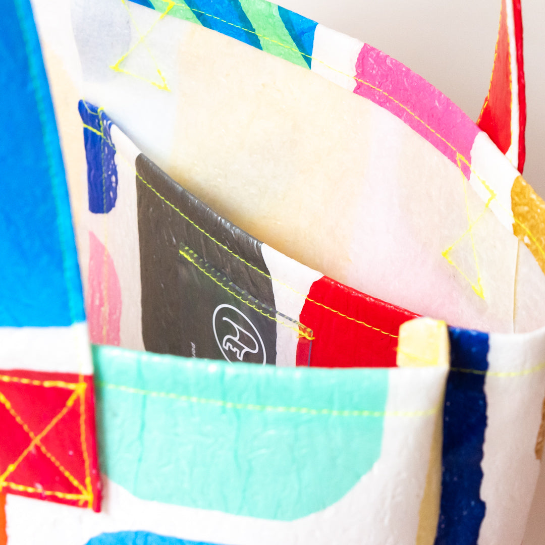 poRiffの主な材料は買い物したときにもらう買い物袋です。一見捨ててしまうような買い物袋たちをコラージュし、熱で圧着して完成するシートを使用してプロダクトに変えています。