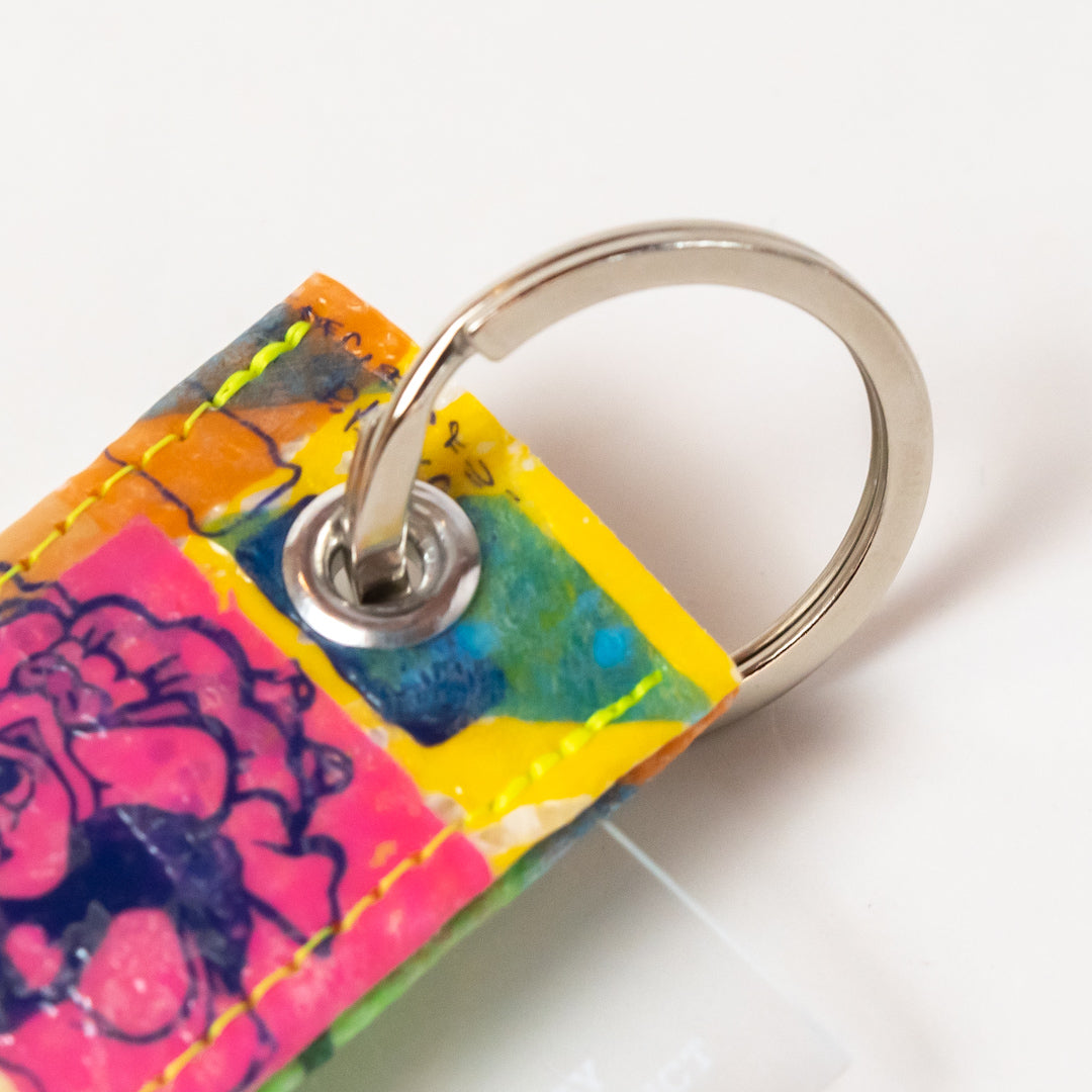 一見捨ててしまうような買い物袋たちをコラージュし、熱で圧着して完成するシートを使用してプロダクトに変えています。