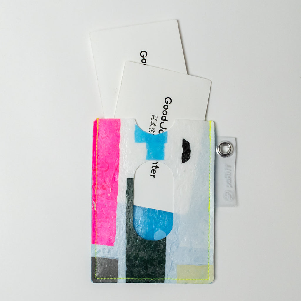 カラフルな柄のパスケースです。ひとつひとつ柄が違うので、お好きなモノを選んでください。裏、表にカードを入れられるので、2枚収納できます。