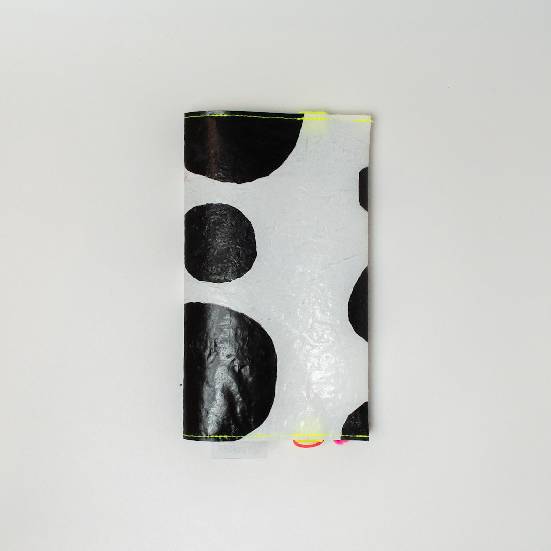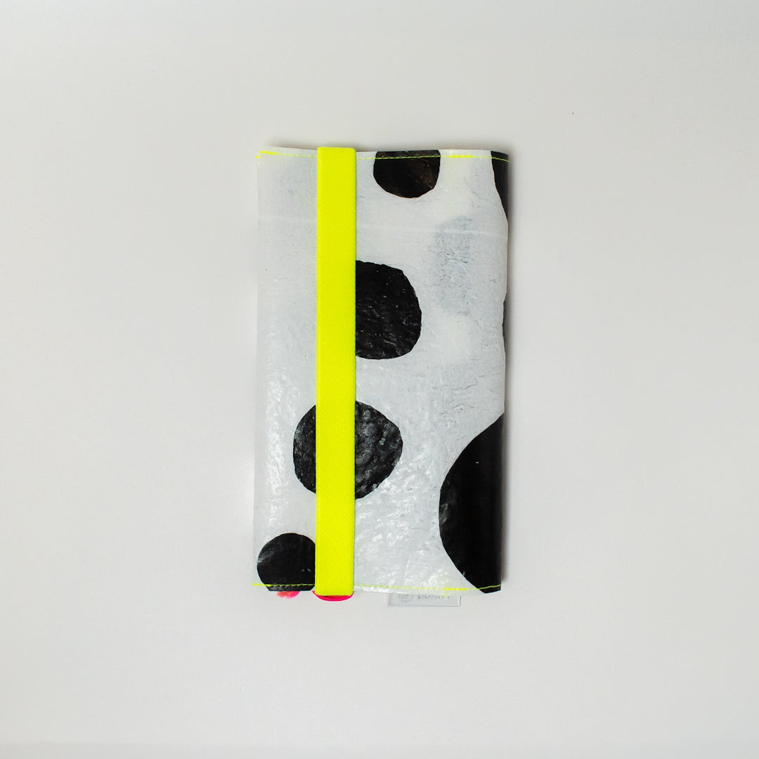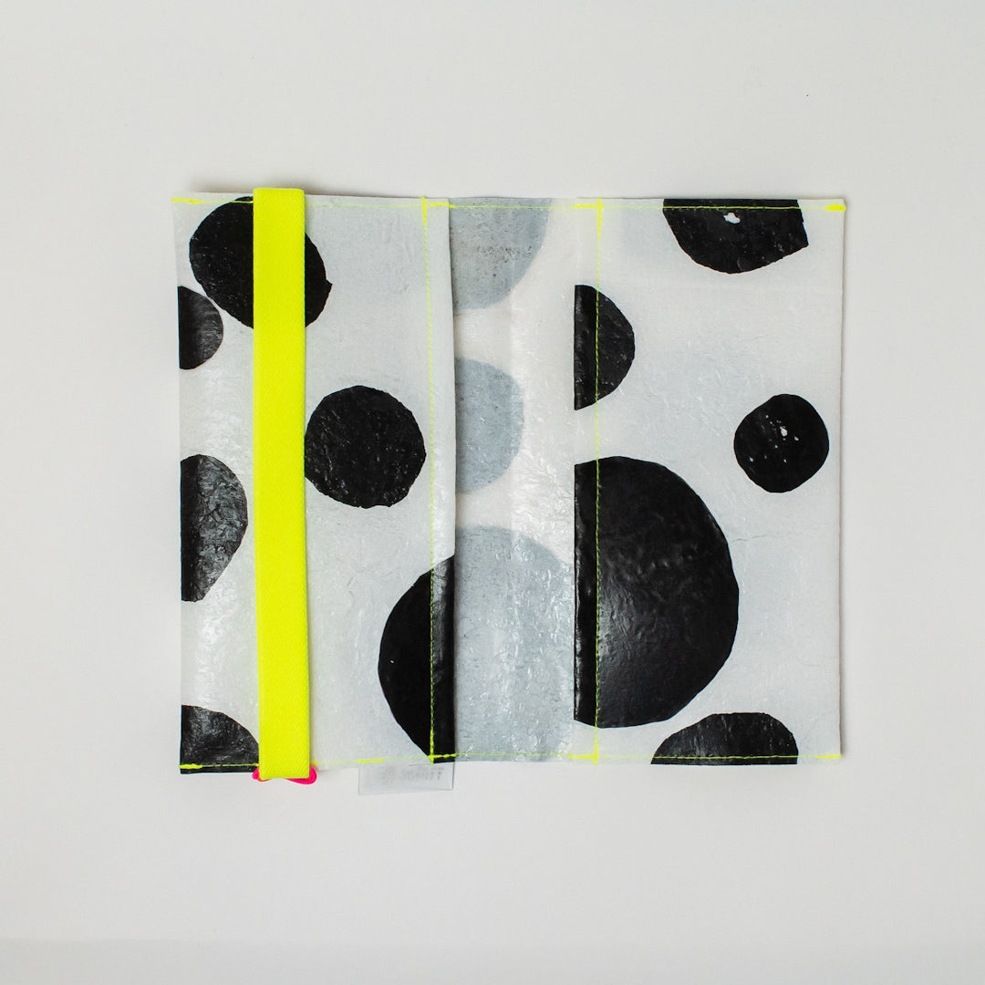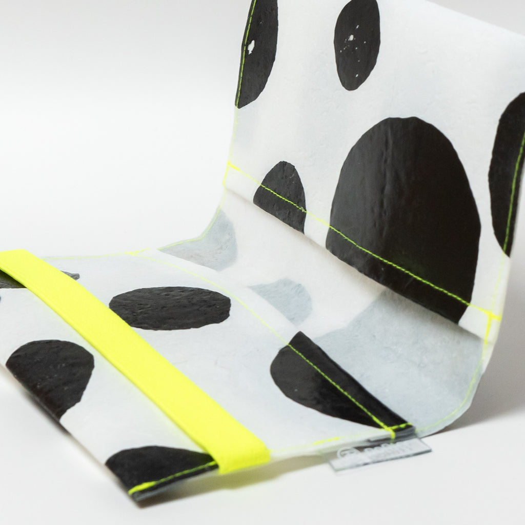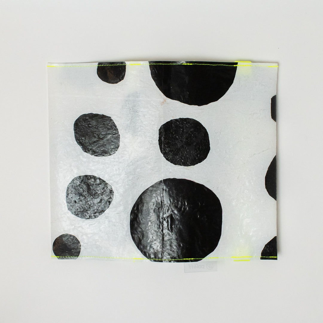 一見捨ててしまうような買い物袋たちをコラージュし、熱で圧着して完成するシートを使用してプロダクトに変えています。