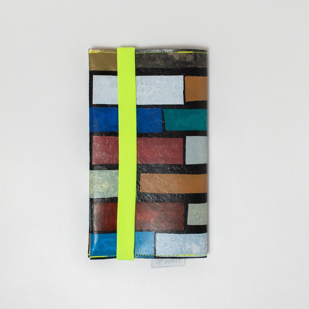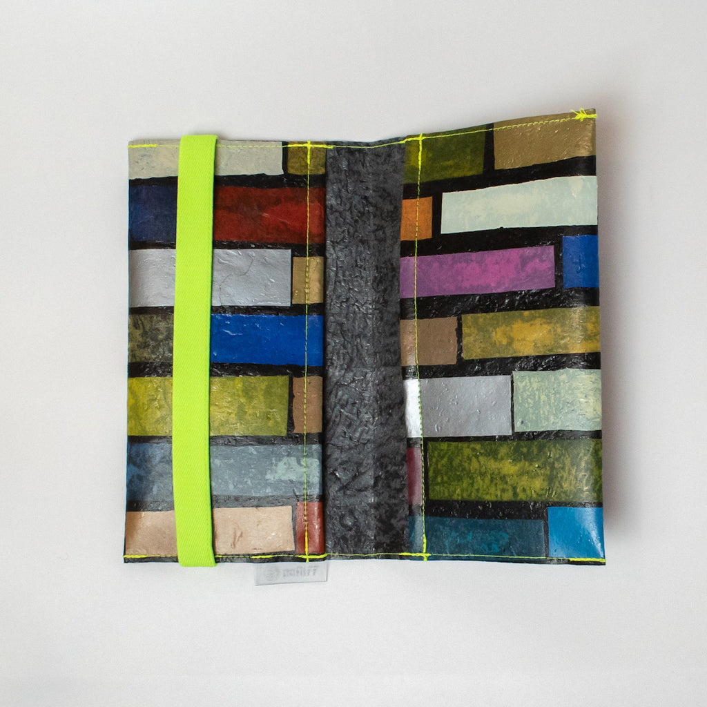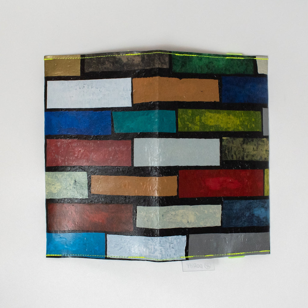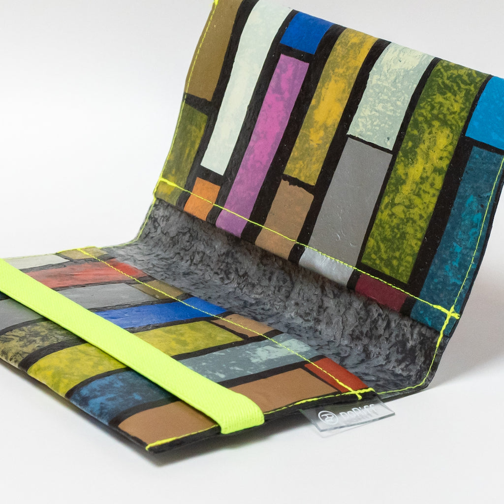 一見捨ててしまうような買い物袋たちをコラージュし、熱で圧着して完成するシートを使用してプロダクトに変えています。