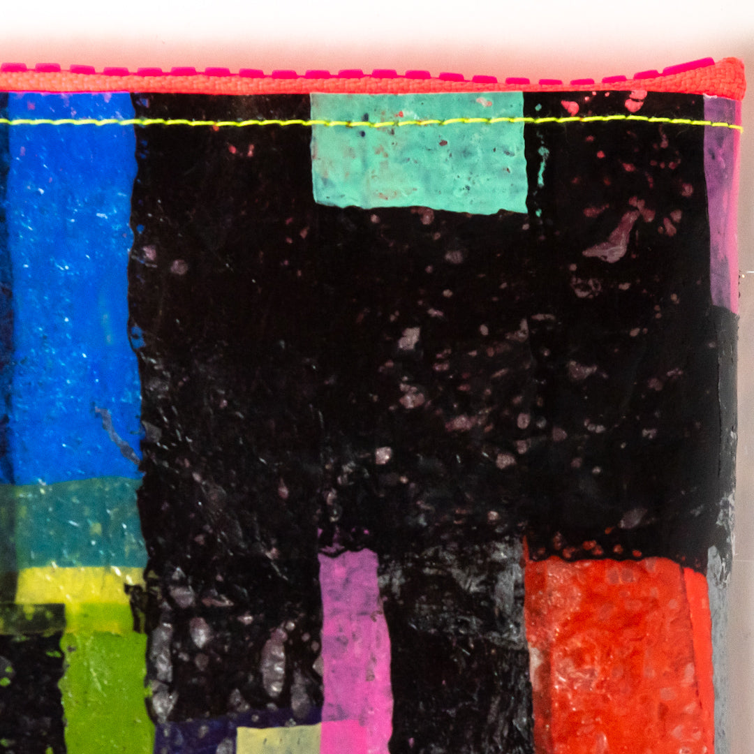poRiffの主な材料は買い物したときにもらう買い物袋です。一見捨ててしまうような買い物袋たちをコラージュし、熱で圧着して完成するシートを使用してプロダクトに変えています。カラーはすべて買い物袋そのままの色。着色は一切していません。