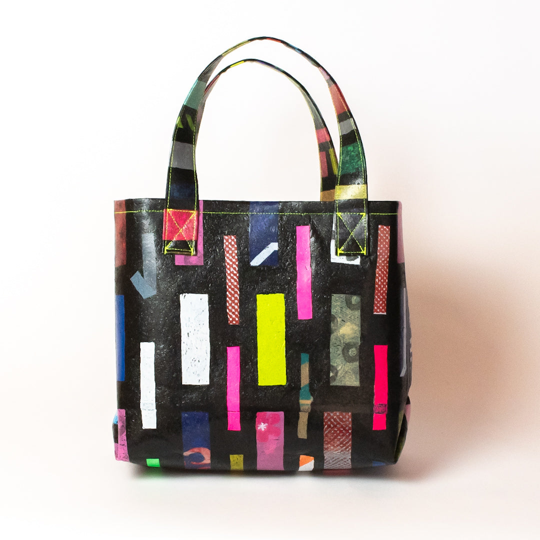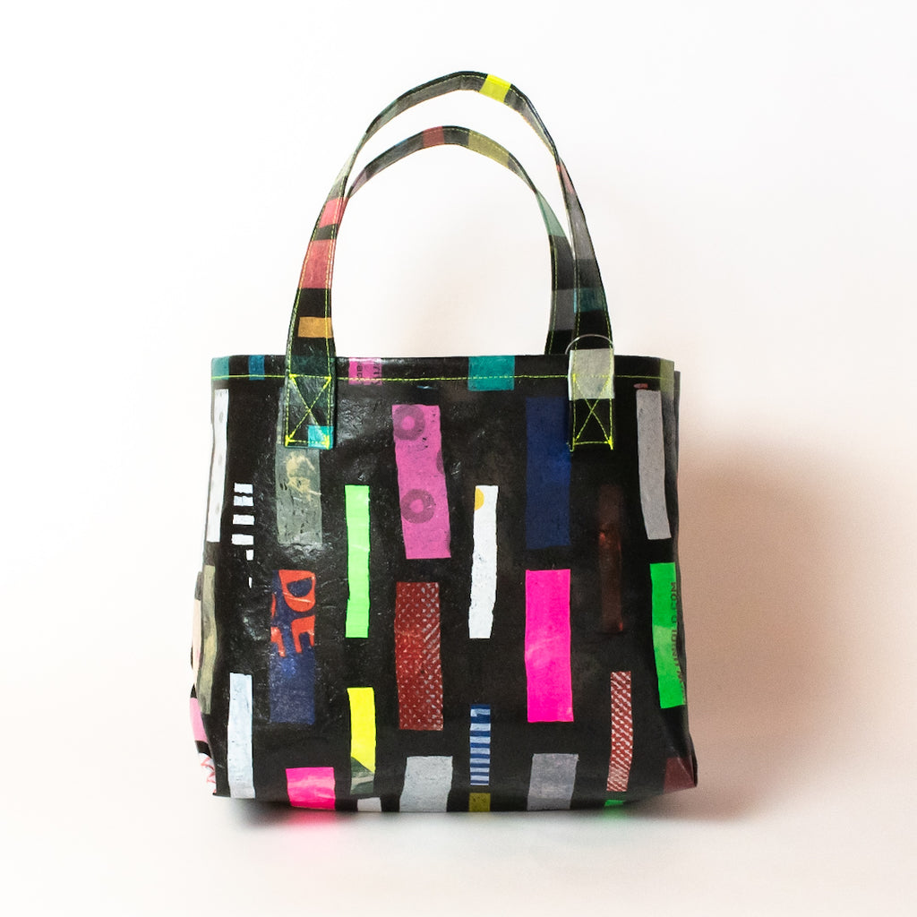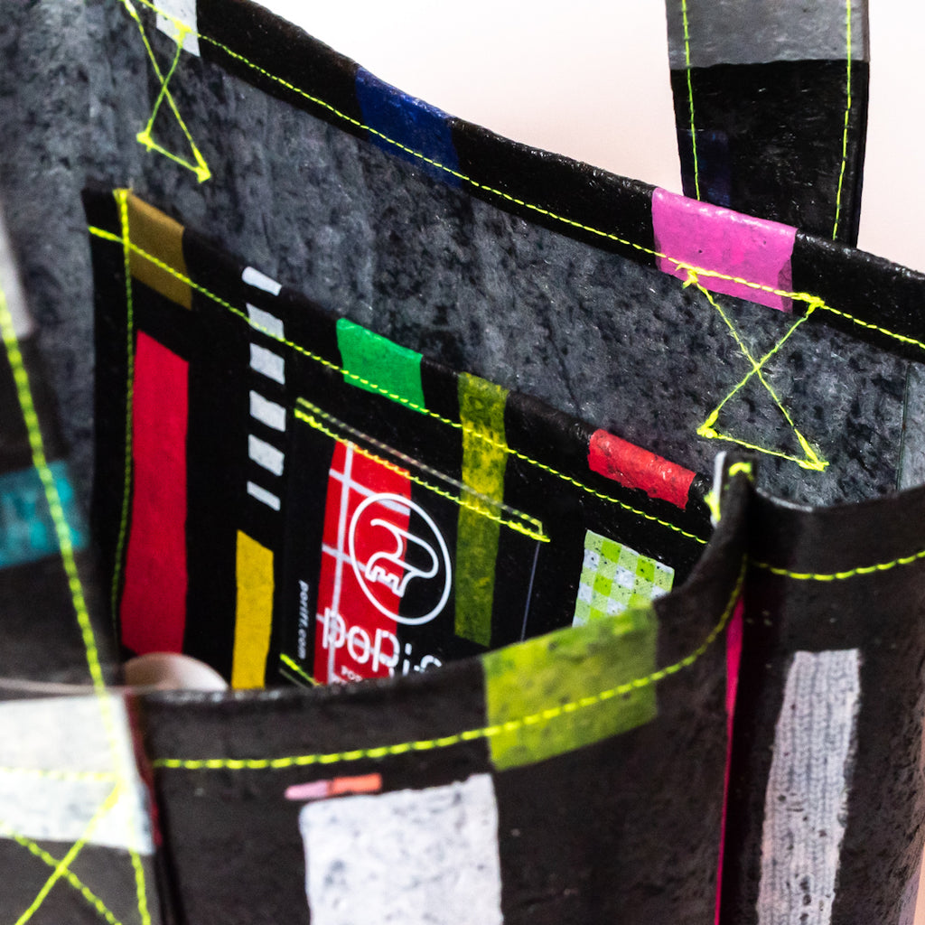 poRiffの主な材料は買い物したときにもらう買い物袋です。一見捨ててしまうような買い物袋たちをコラージュし、熱で圧着して完成するシートを使用してプロダクトに変えています。