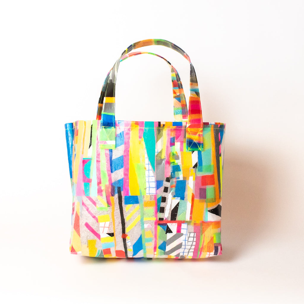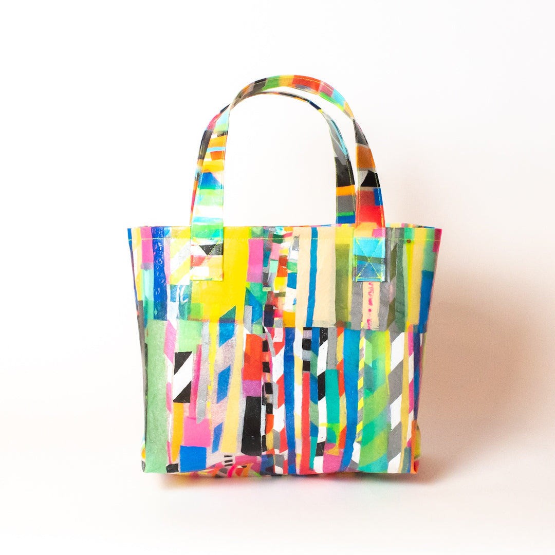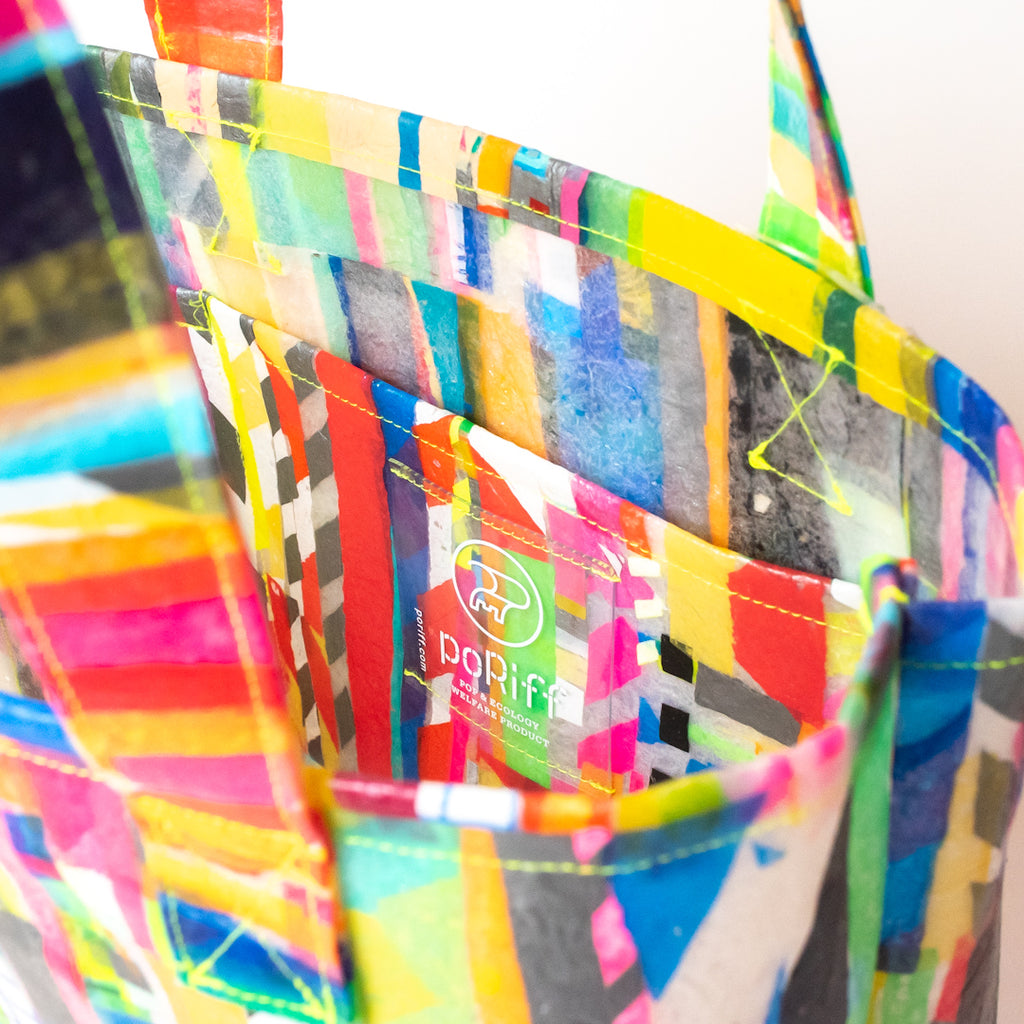 poRiffの主な材料は買い物したときにもらう買い物袋です。一見捨ててしまうような買い物袋たちをコラージュし、熱で圧着して完成するシートを使用してプロダクトに変えています。
