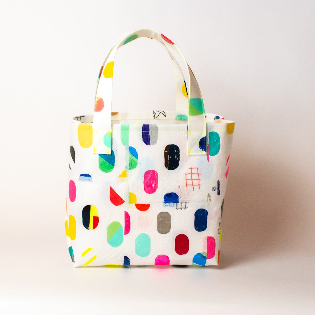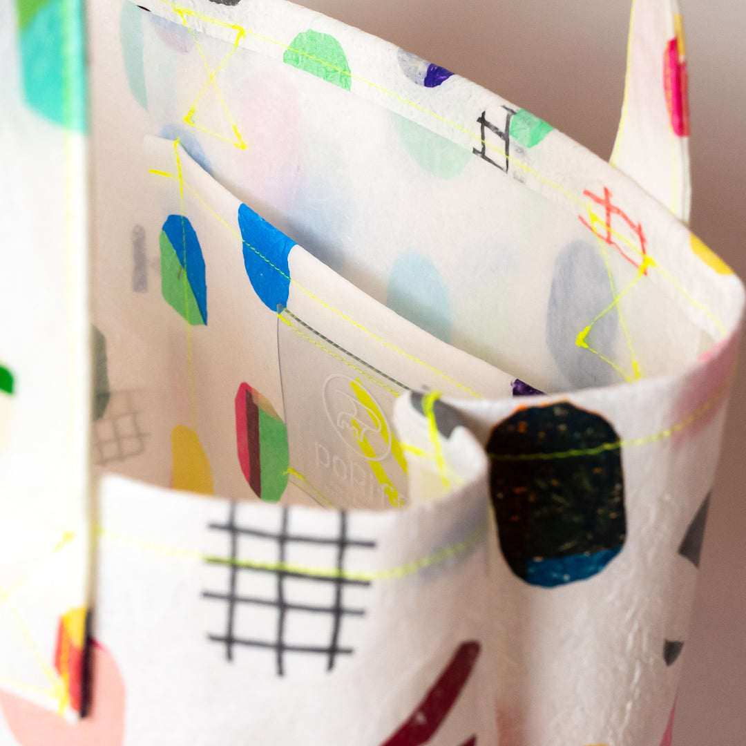 poRiffの主な材料は買い物したときにもらう買い物袋です。一見捨ててしまうような買い物袋たちをコラージュし、熱で圧着して完成するシートを使用してプロダクトに変えています。