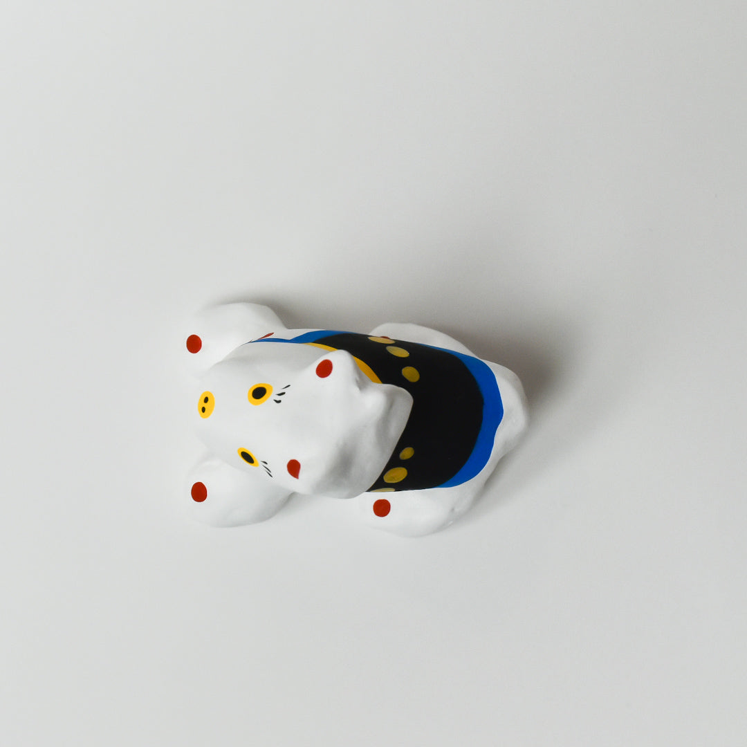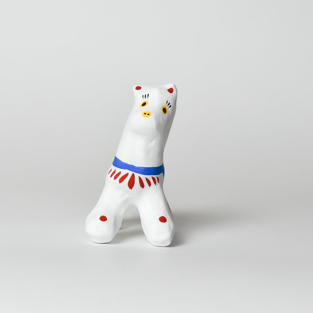 この張り子は、障害のある人のイラストをデザインにいかしたオリジナルの郷土玩具シリーズです。木型に代わり3Dプリント技術で出力した張り子型を使い、手作業で一つひとつ紙を貼り合わせて絵付けしています。