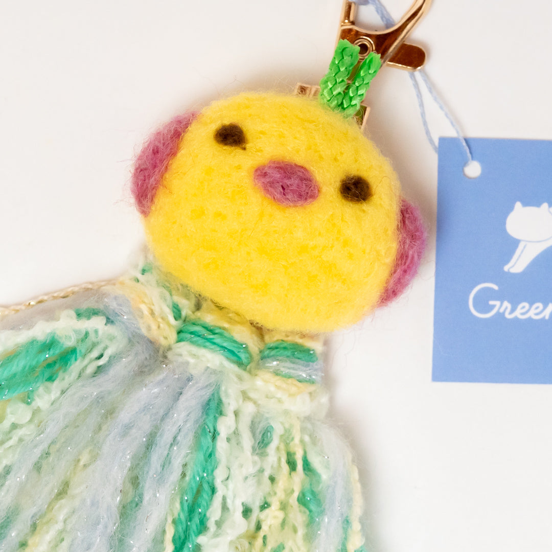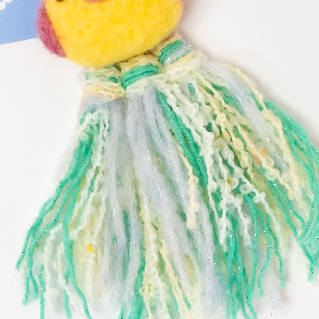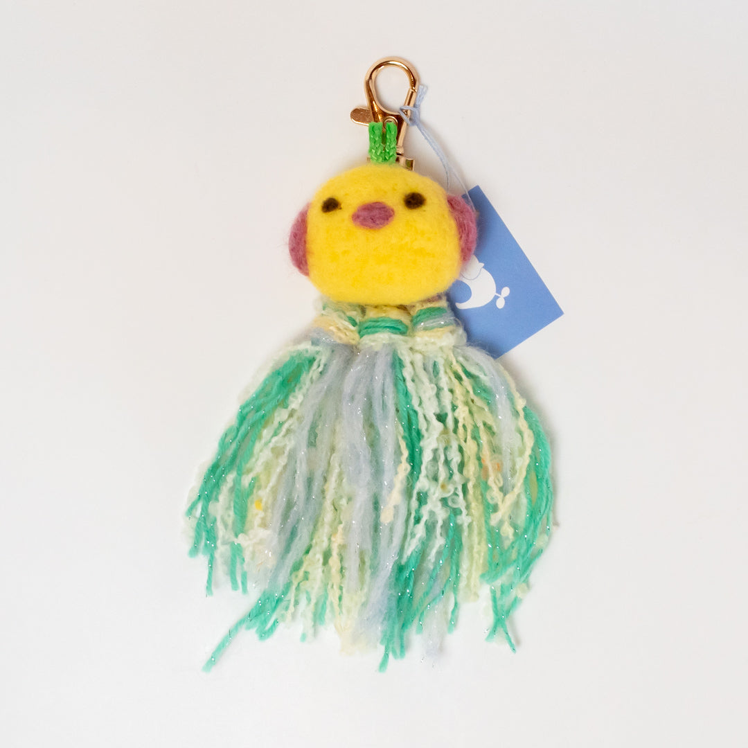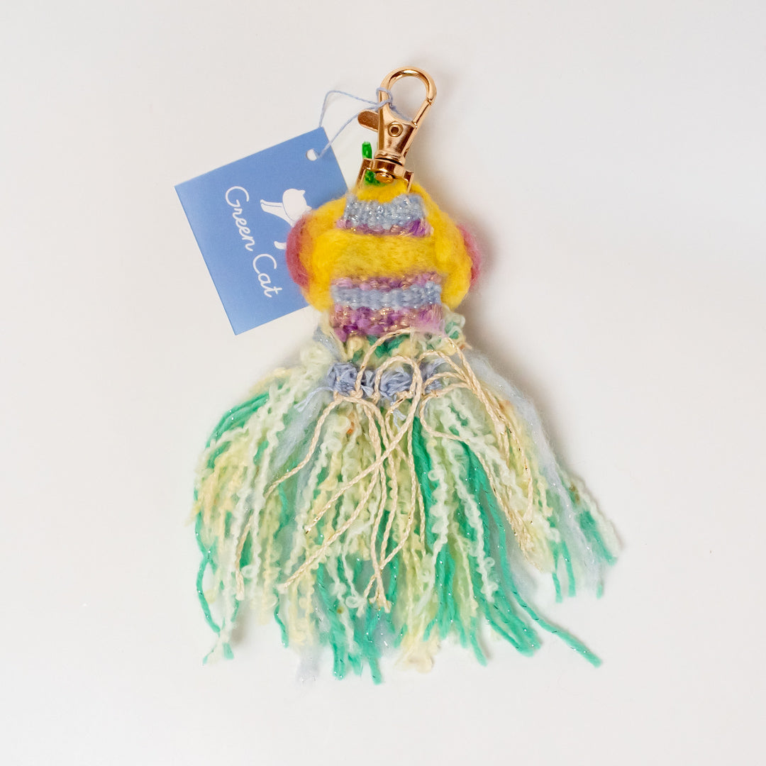 ユニークなキャラクターのキーホルダーを、ウィービングと羊毛で製作しました。メンバーのMOCOLINさんが自由な発想で製作した商品です。
