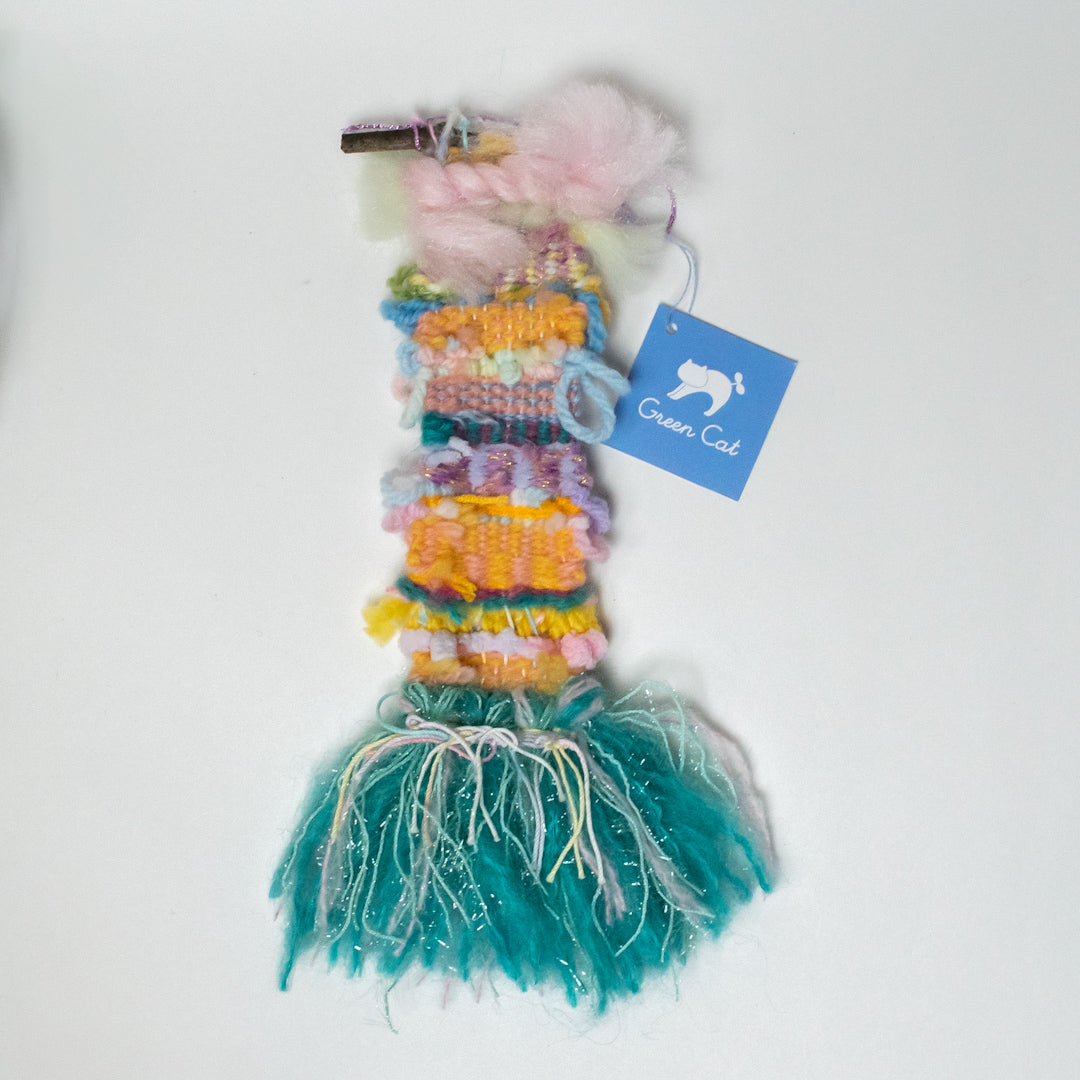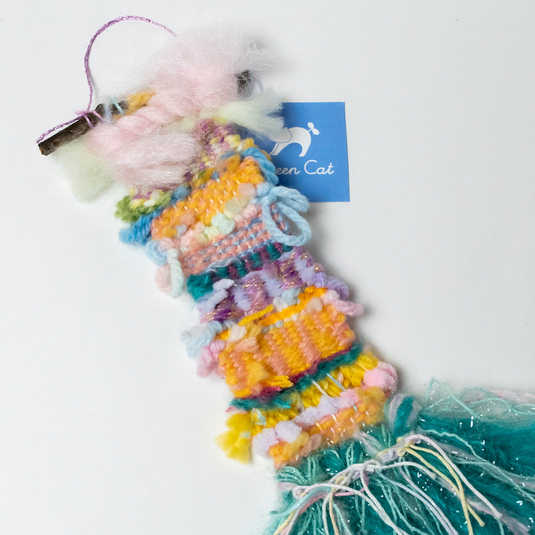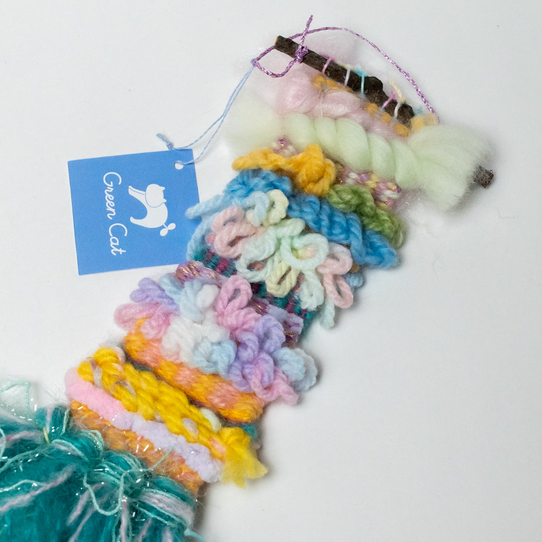 メンバーのMOCOLINさんが自由な発想で製作した商品です。ウィービングと羊毛で製作しました。部屋に飾ると明るい光景になるタペストリーです。