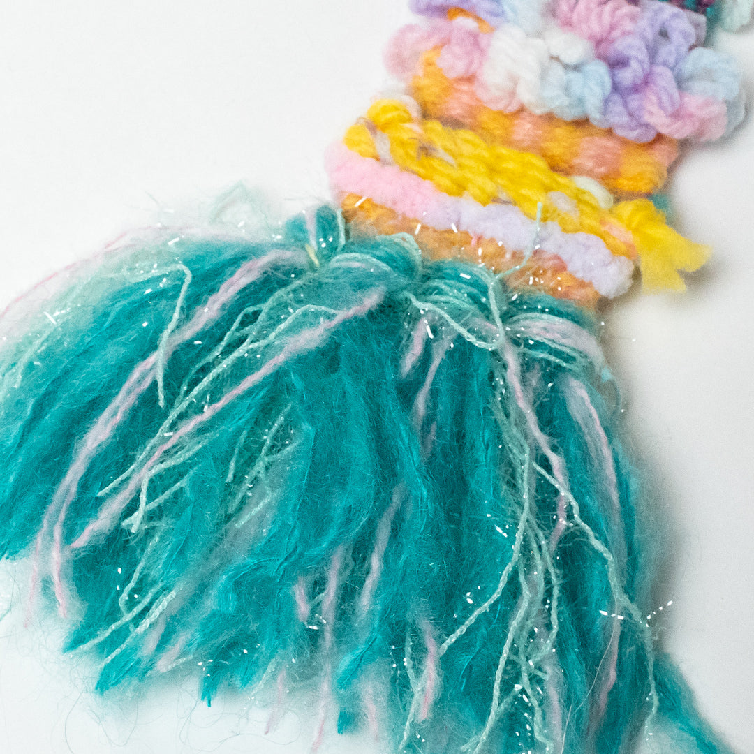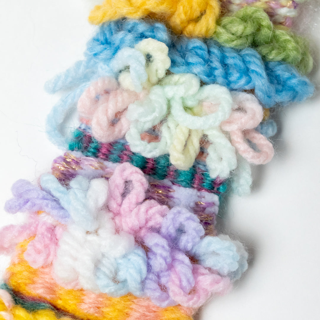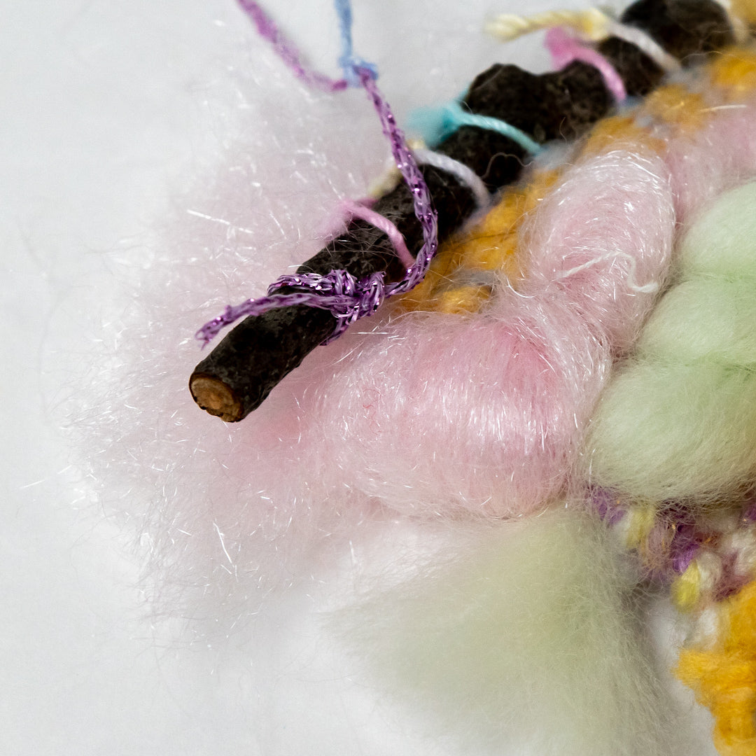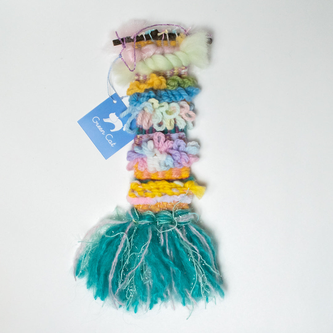 メンバーのMOCOLINさんが自由な発想で製作した商品です。ウィービングと羊毛で製作しました。部屋に飾ると明るい光景になるタペストリーです。