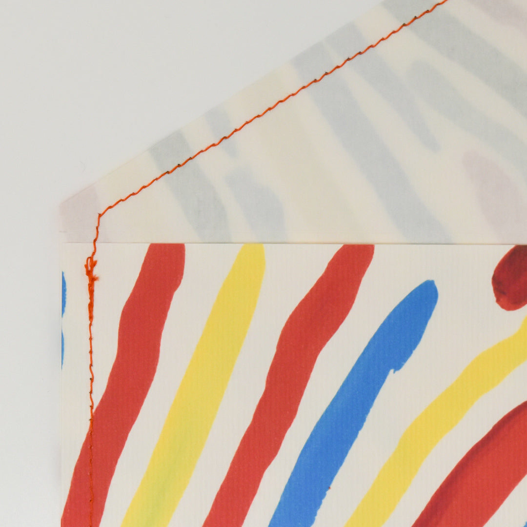 アートに溶け込む配色のステッチカラーが目にとまり、手で持ったときに触れる縫い目には、ほかの封筒にはない温かみがあります。
