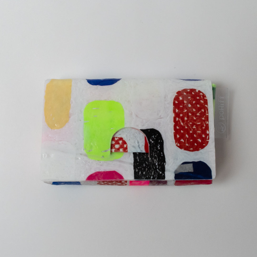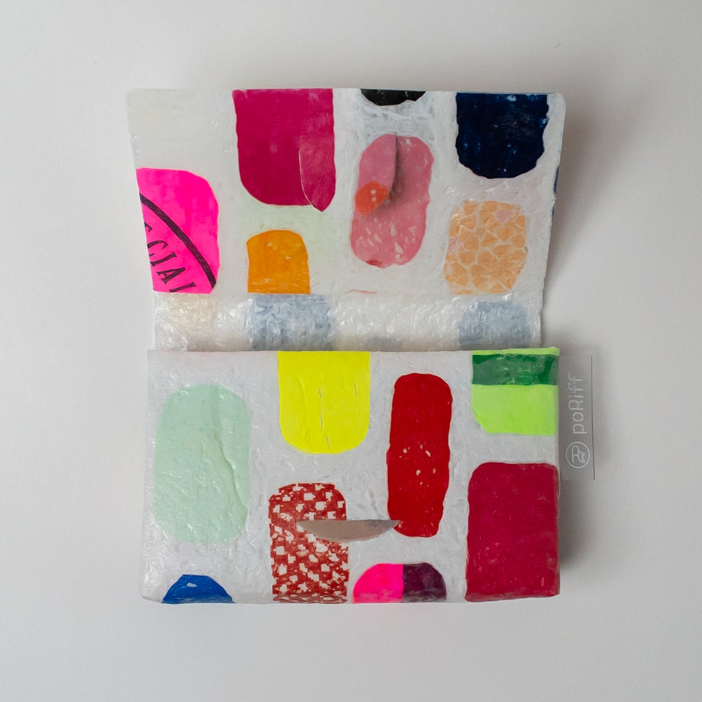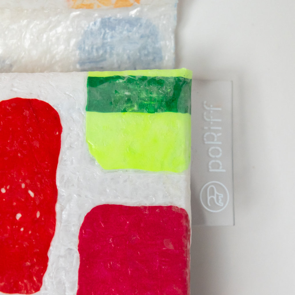 poRiffの主な材料は買い物したときにもらう買い物袋です。一見捨ててしまうような買い物袋たちをコラージュし、熱で圧着して完成するシートを使用してプロダクトに変えています。カラーはすべて買い物袋そのままの色。着色は一切していません。