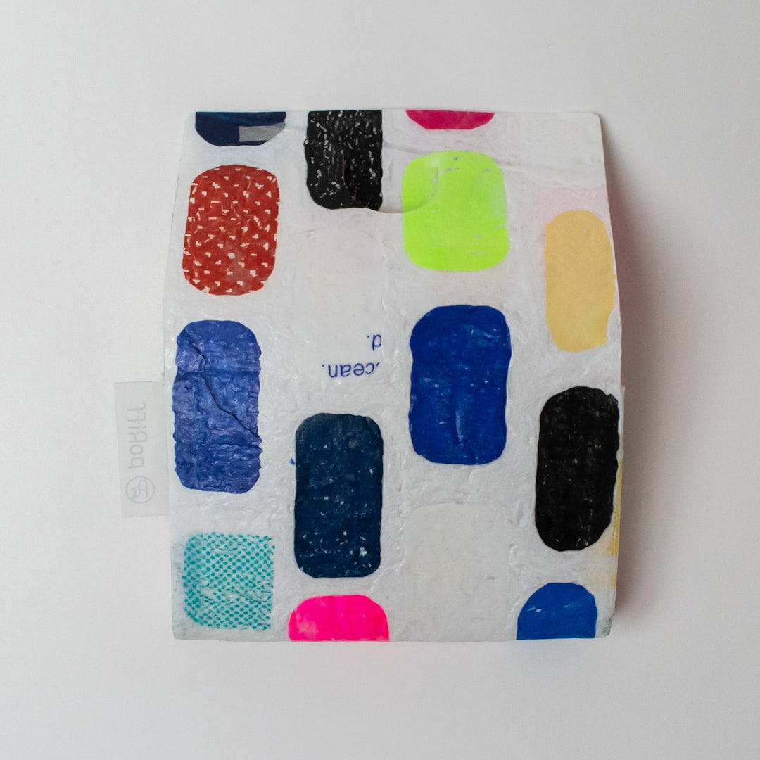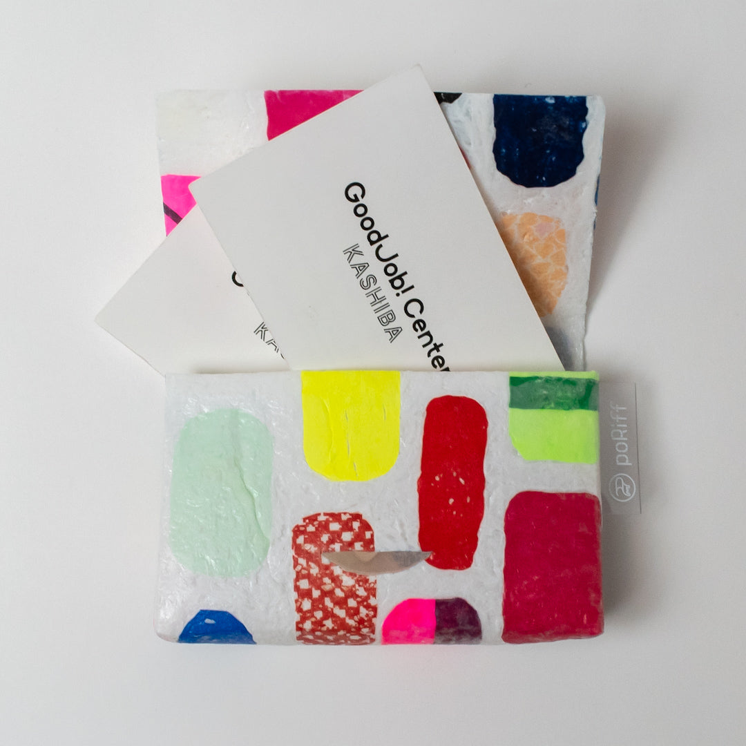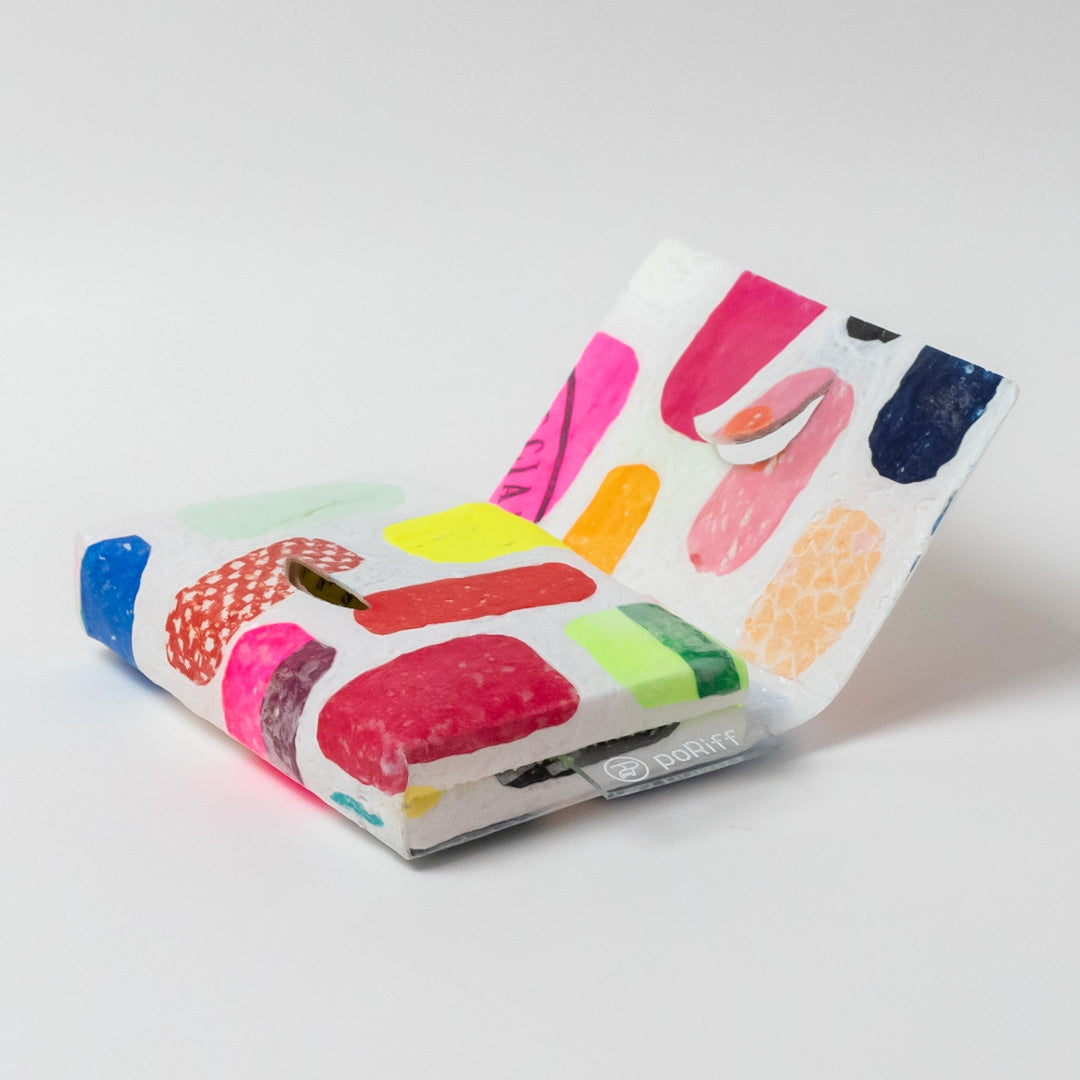 poRiffの主な材料は買い物したときにもらう買い物袋です。一見捨ててしまうような買い物袋たちをコラージュし、熱で圧着して完成するシートを使用してプロダクトに変えています。カラーはすべて買い物袋そのままの色。着色は一切していません。